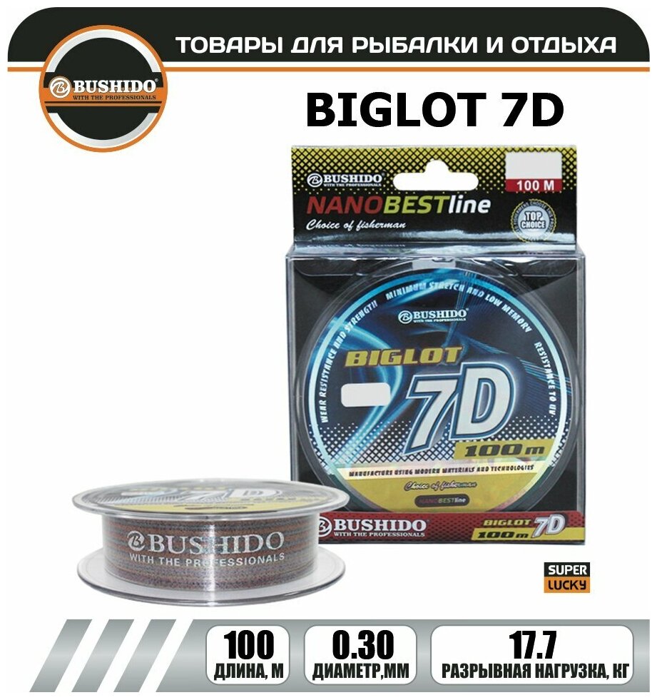Леска рыболовная BUSHIDO BIGLOT 7D (100м); (d - 0,3мм); (тест - 17,7кг) информация: