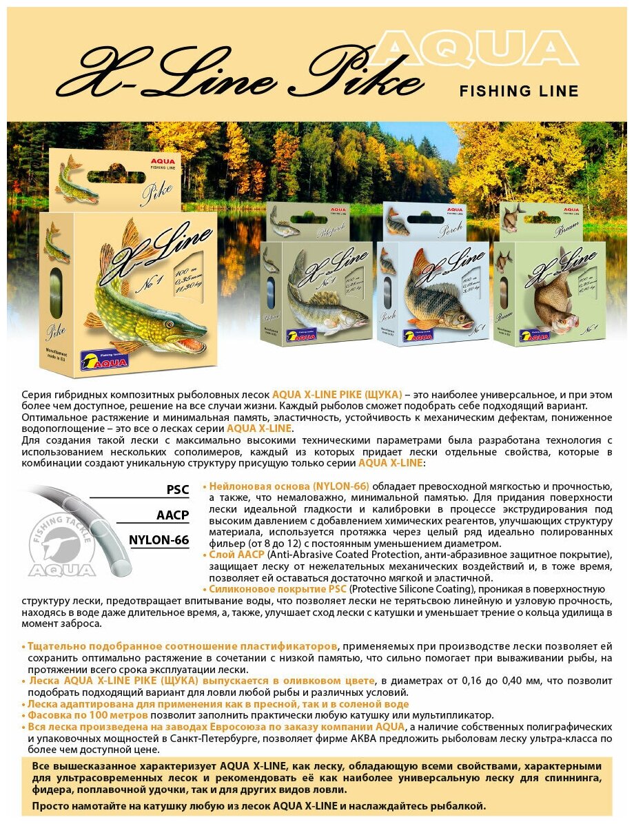 Монофильная леска для рыбалки Aqua X-Line Pike (Щука) 0,35mm 100m ( 6 штук ) 1 078 ₽