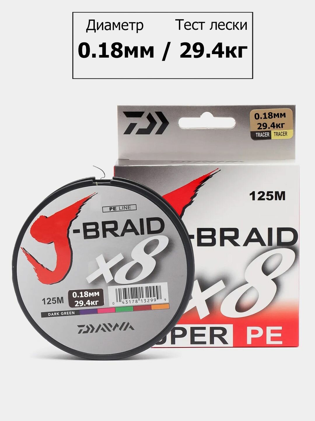 Плетеный шнур для рыбалки Daiwa J-Braid X 8, 0.18мм 29.4кг 125 м темно зеленый (полиэтиленовое волокно) информация: