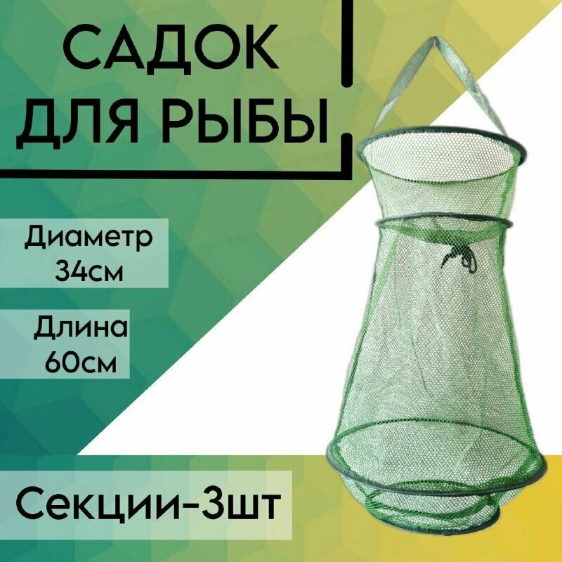 Садок рыболовный капроновый, Зеленый 3 секции 60 см, d-34 см;береговой, карповый, для рыбалки информация: