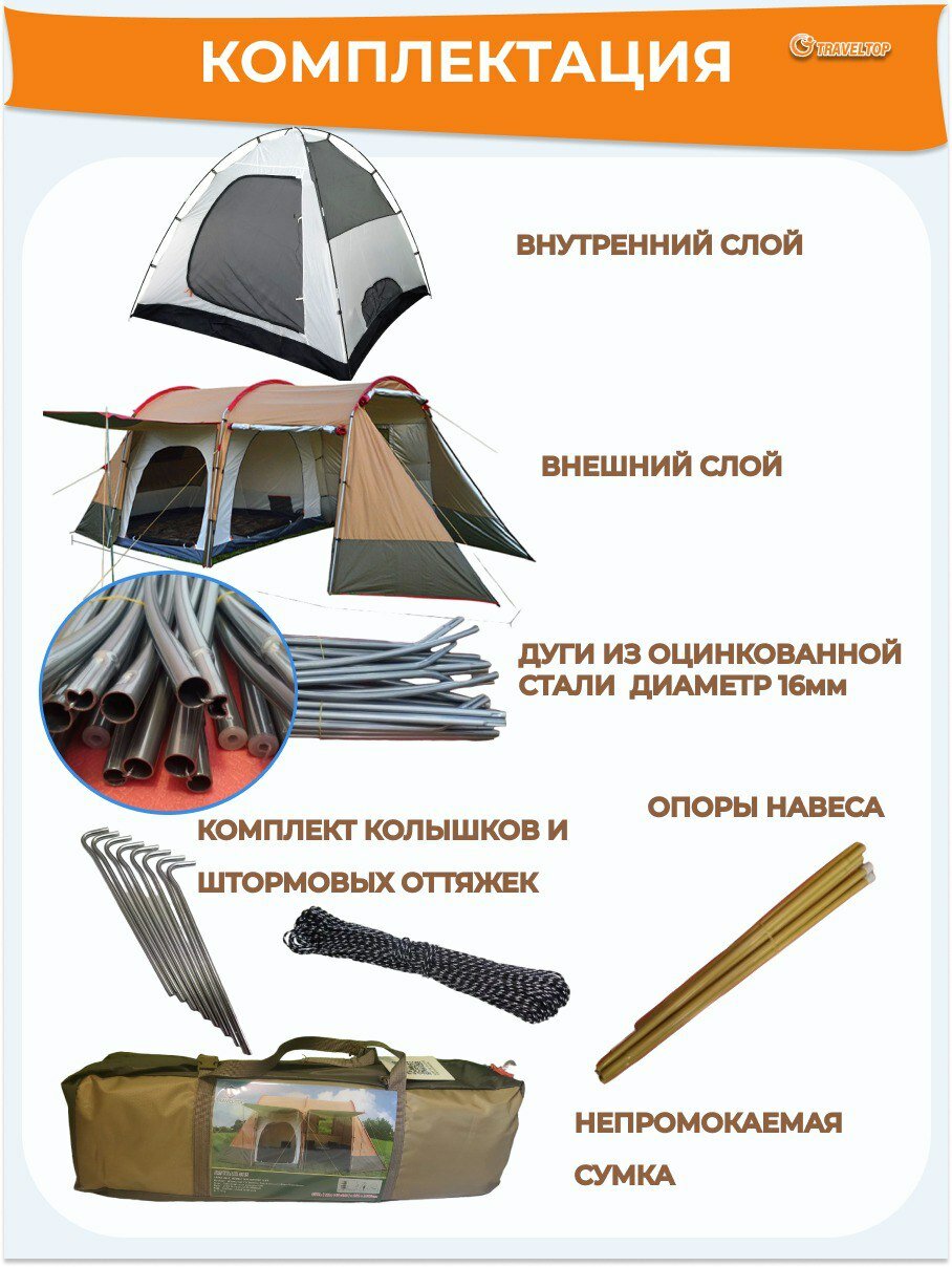 10 цен на Палатка кемпинговая, Traveltop 1915, 4-х местная с большим тамбуром-кухней, 240х142х120, h195см