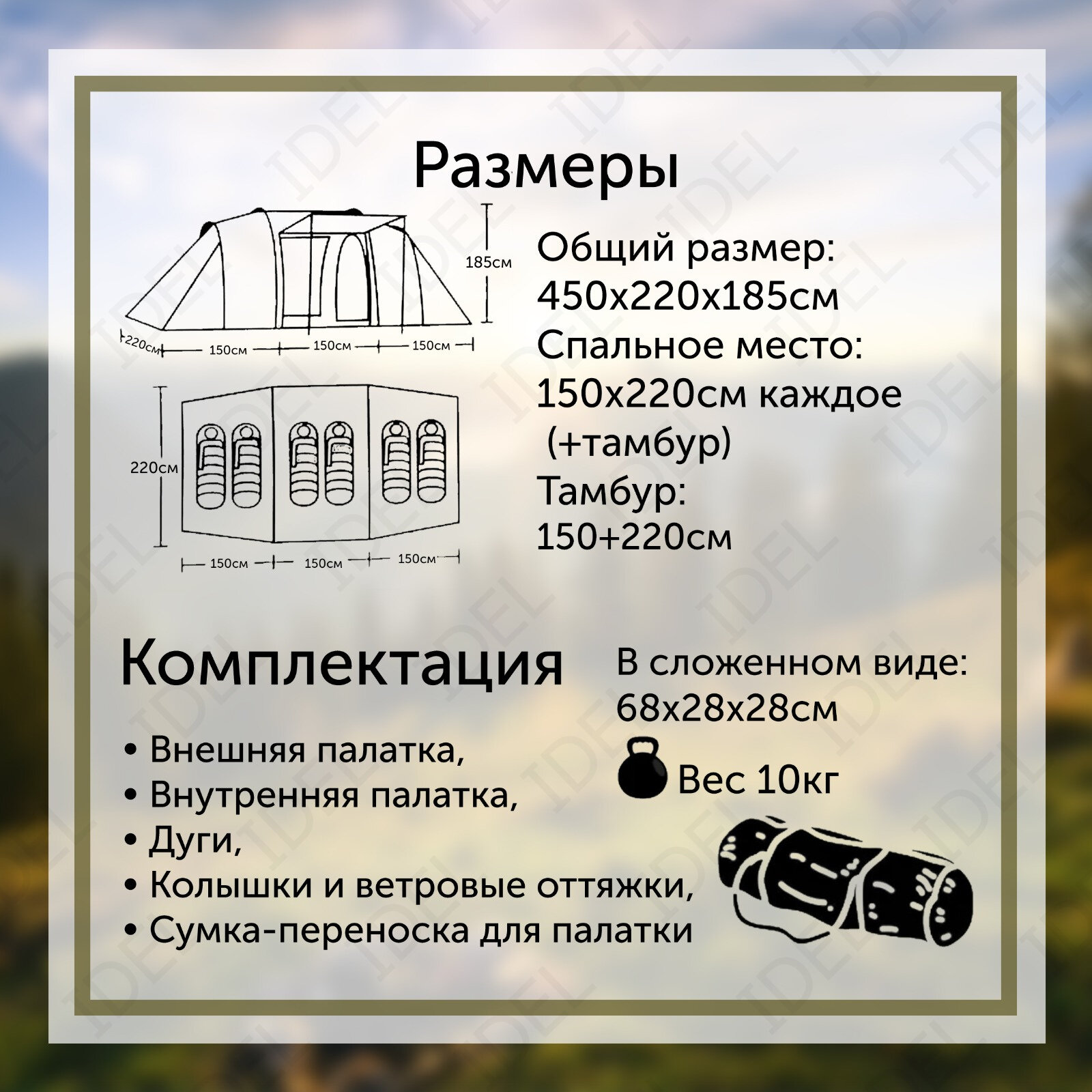 | Габариты внешней палатки(ДxШxВ) | 450x220x185 cм |