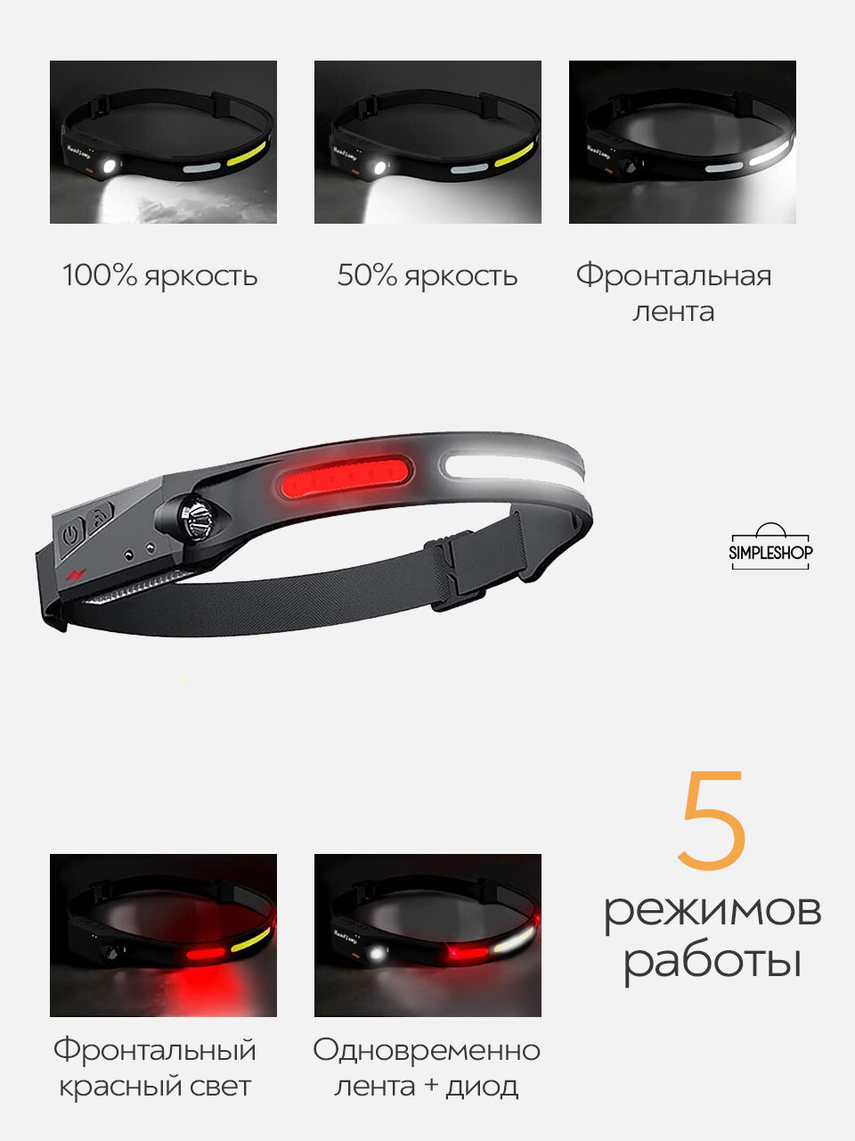 Фонарь налобный аккумуляторный SimpleShop с сенсорным выключателем, 6 режимов 680 ₽