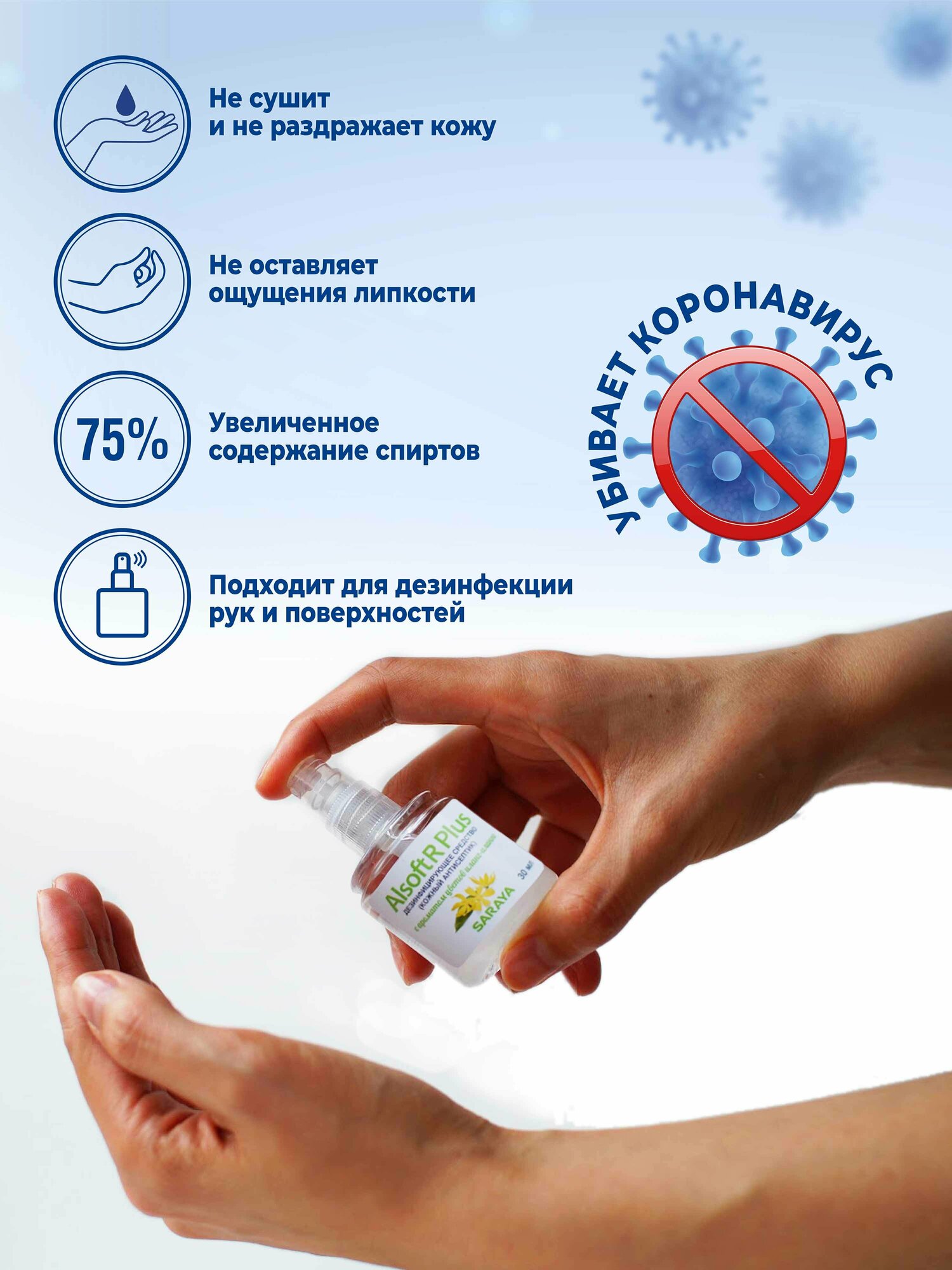 Saraya Alsoft R+ Антисептик кожный для дезинфекции рук с ароматом цветов иланг-иланга, спрей 30 мл