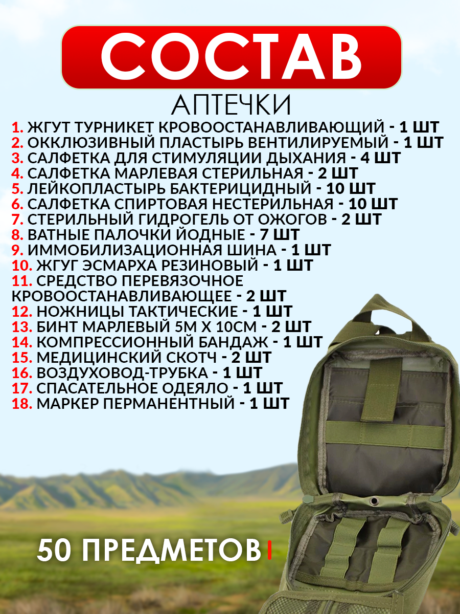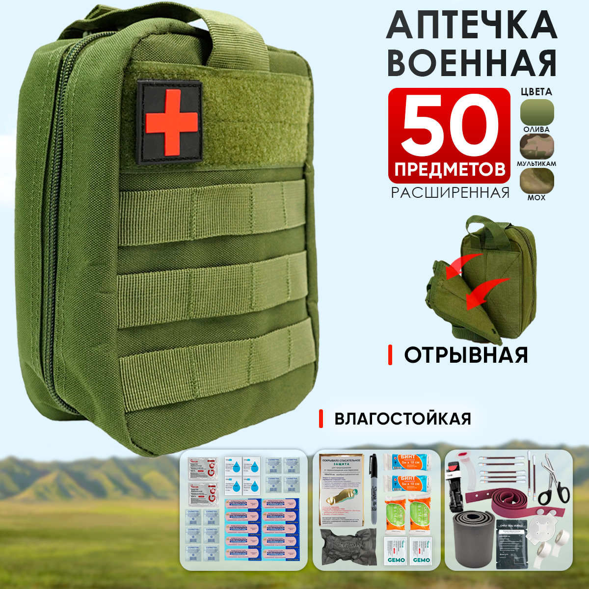 Аптечка тактическая укомплектованная 50шт олива информация: