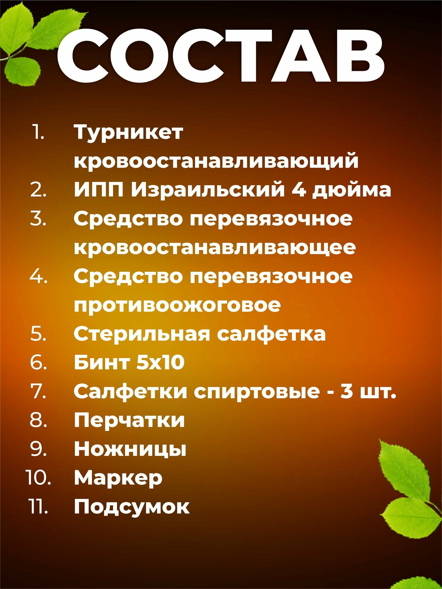 | Состав | 1. Ножницы тактические тупоконечные 15см. - 1шт.; 2. ИПП бандаж Израильский 4" - 1шт.; 3. Турникет кровоостанавливающий - 1шт.; 4. Средство перевязочное гидрогелевое противоожоговое (салфетка стерильная 13х18см) "Эверс Лайф-С" - 1шт; 5. Средство кровоостанавливающее (салфетка стерильная 13х18) "Эверс Лайф-Гемо" - 1шт.; 6. Бинт стерильный 5х10 - 1шт; 7. Перчатки нитриловые, размер L - 1 пара; 8. Салфетка инъекционная спиртовая - 3шт.; 9. Салфетка марлевая медицинская (16х14 упаковка 10шт) - 1 упаковка; 10. Маркер черный перманентный – 1 шт; 11. Подсумок-аптечка тактическая - 1шт. |