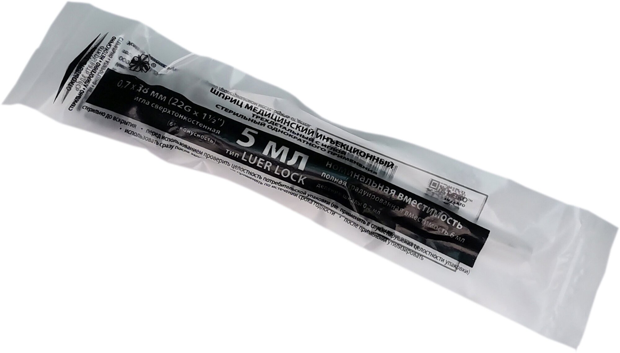 | Дополнительная информация | полная градуированная вместимость 6 мл, деление шкалы 0,2 мл, игла инъекционная атравматическая сверхтонкостенная LUER lock 0,7 х 38мм (22G x 1½") |