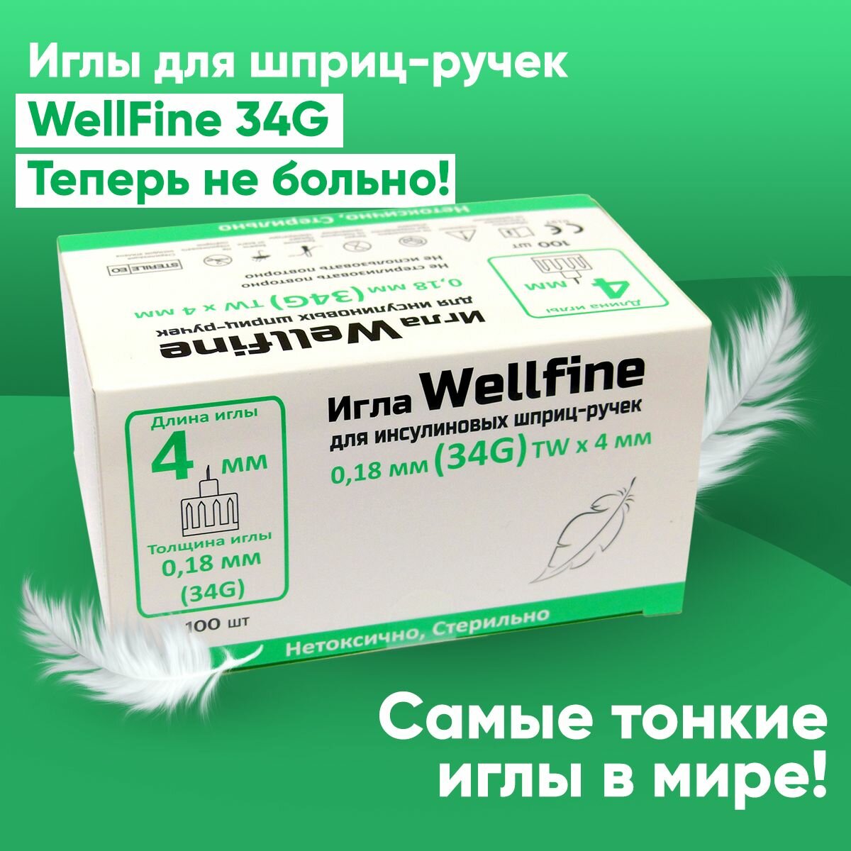 Иглы для шприц-ручек WellFine (Веллфайн), TW 34G, толщина 0,18 мм, длина 4 мм, ультратонкие, 100 штук информация: