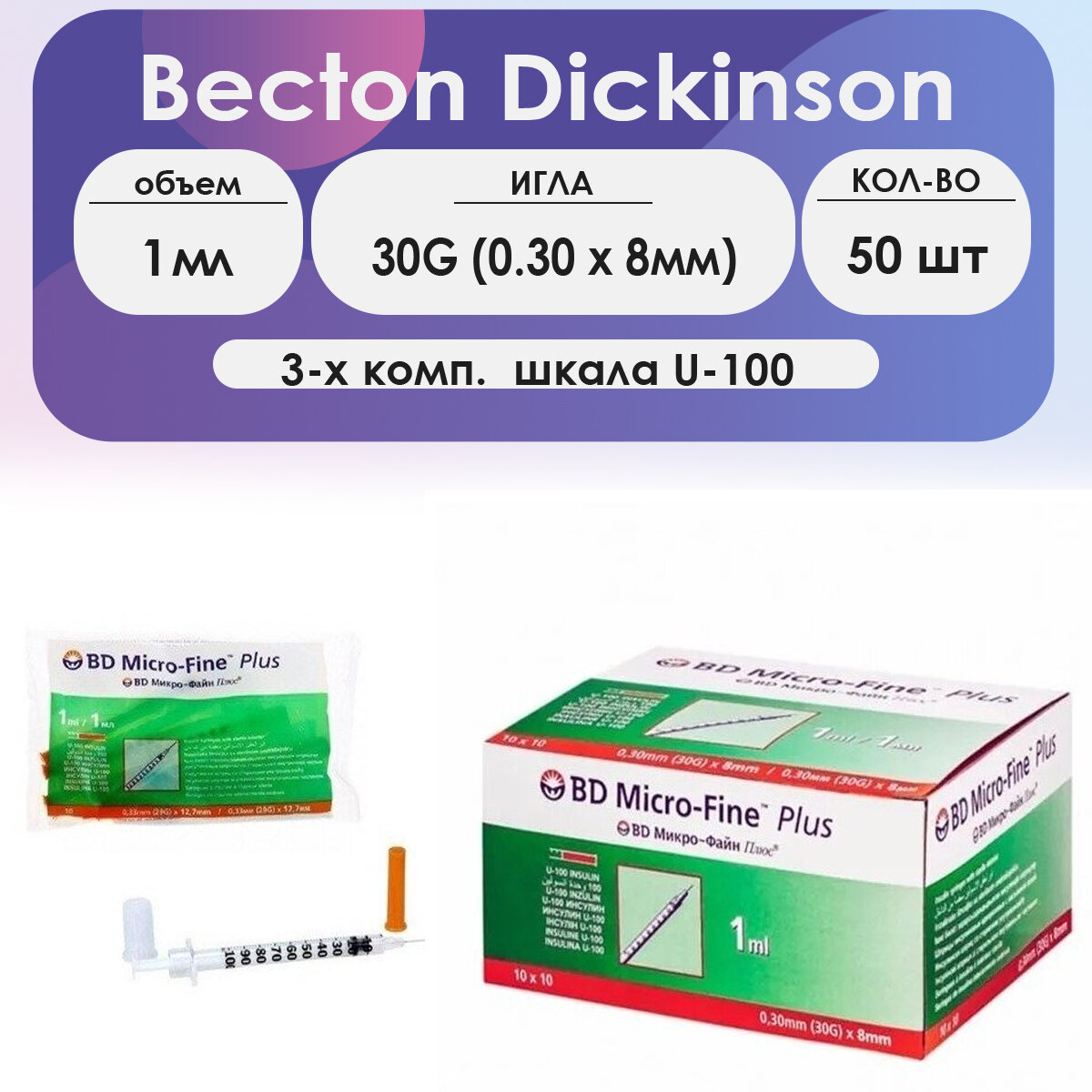10 цен на Шприц BD Micro-Fine Plus (3-комп.) 1 мл U100 игла 30G (0,30х8) - 50 шт