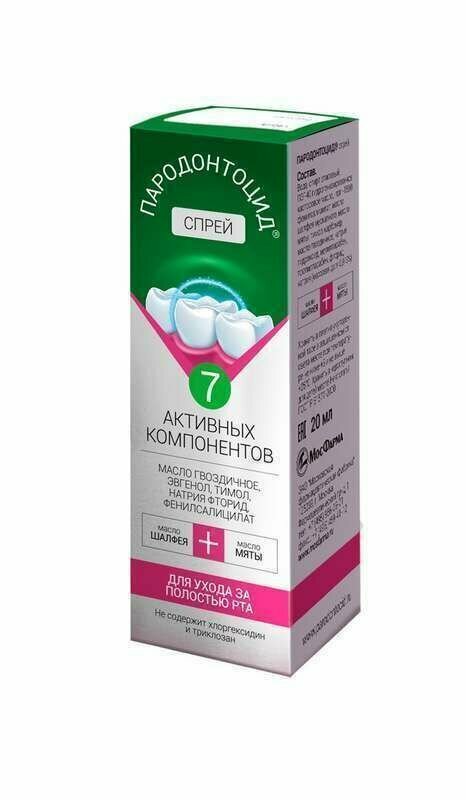 | Дополнительная информация | Описание7 Активных компонентов - масло шалфея, масло гвоздичное, масло мяты, натрия фторид, фенилсалицилат, масло душицы, тимол. Способствуют уменьшению вомпаления и кровоточивости десен и защите эмали зубов, не нарушая нормальную микрофлору полости рта.Не содержит хлоргексидин и триклозан.ПоказанияПАРОДОНТОЦИД® спрей:• защищает от воспаления в течение дня• устраняет неприятный запах изо рта• удобен в использованииПротивопоказанияИндивидуальная непереносимость компонентов продукта |