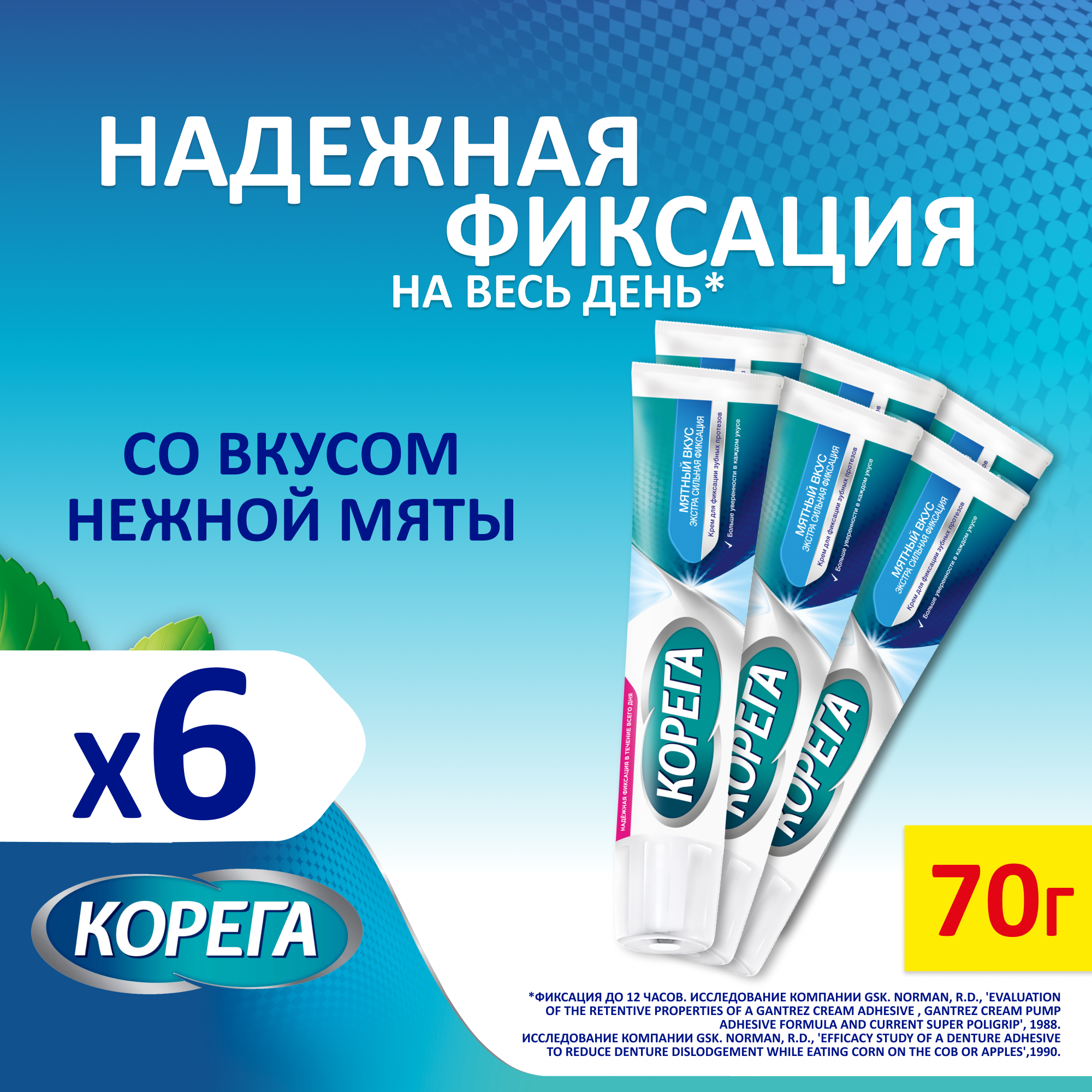 Корега Экстра Сильный Мятный крем для всесторонней фиксации съемных зубных протезов до 12 часов, мятная свежесть, 70 г 6 шт информация: