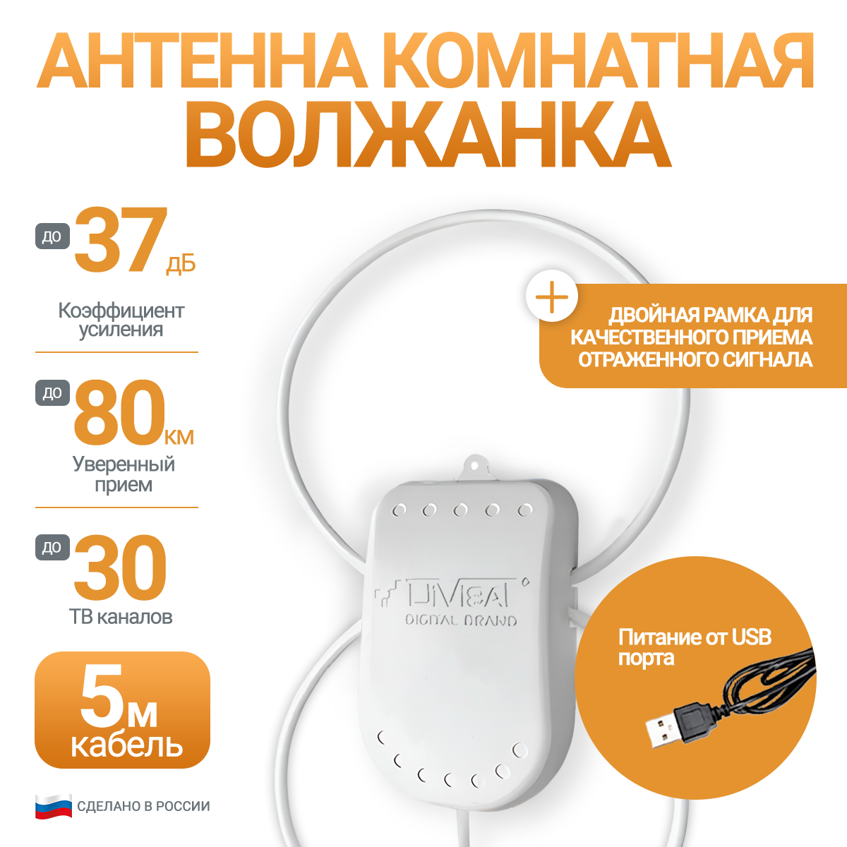 Антенна для цифрового тв комнатная активная Волжанка TWIN USB 5м с присоской информация: