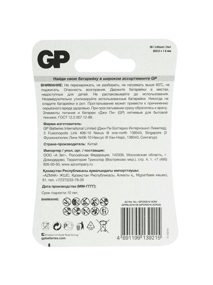 Батарейки GP CR2016 BL2 Lithium, 2 шт информация: