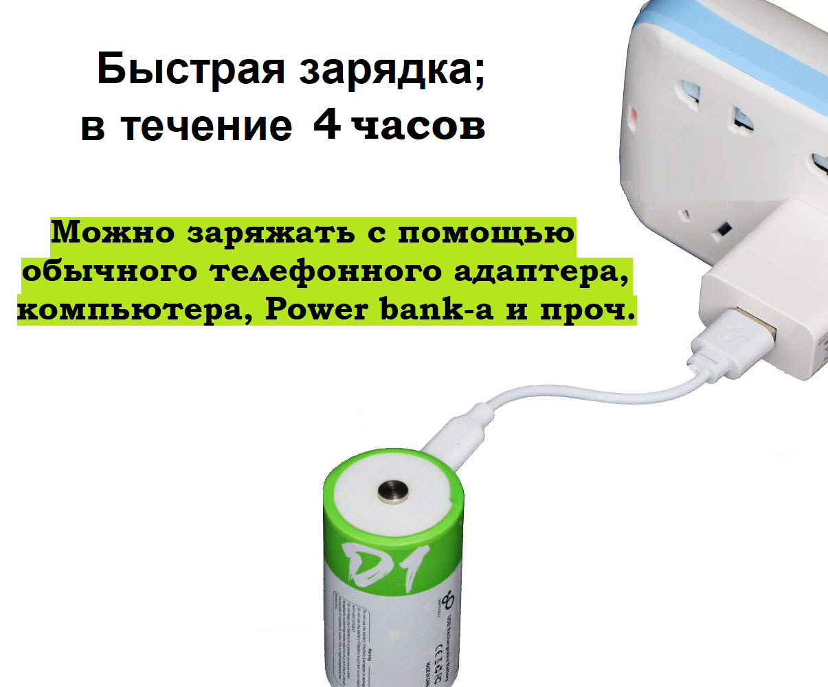 Аккумуляторы LI-ion Тип D-2 шт. (D20, LR20) емкость 12000 mWh 1.5V заряжаемый от кабеля USB Type-C быстрой зарядкой. 1 449 ₽