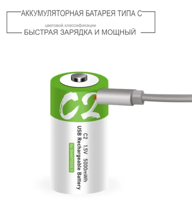 10 цен на Аккумуляторные батарейки тип С 1,5 V 5000 mWh с USB type-C зарядным кабелем, 2 штуки.