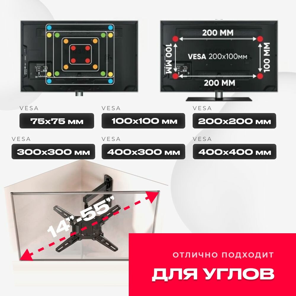 Кронштейн для ТВ LED/LCD телевизора 14-55 до 15 кг дюймов наклонно- поворотный (VESA 100x100, 200x100, 200x200, 100x200)мм информация: