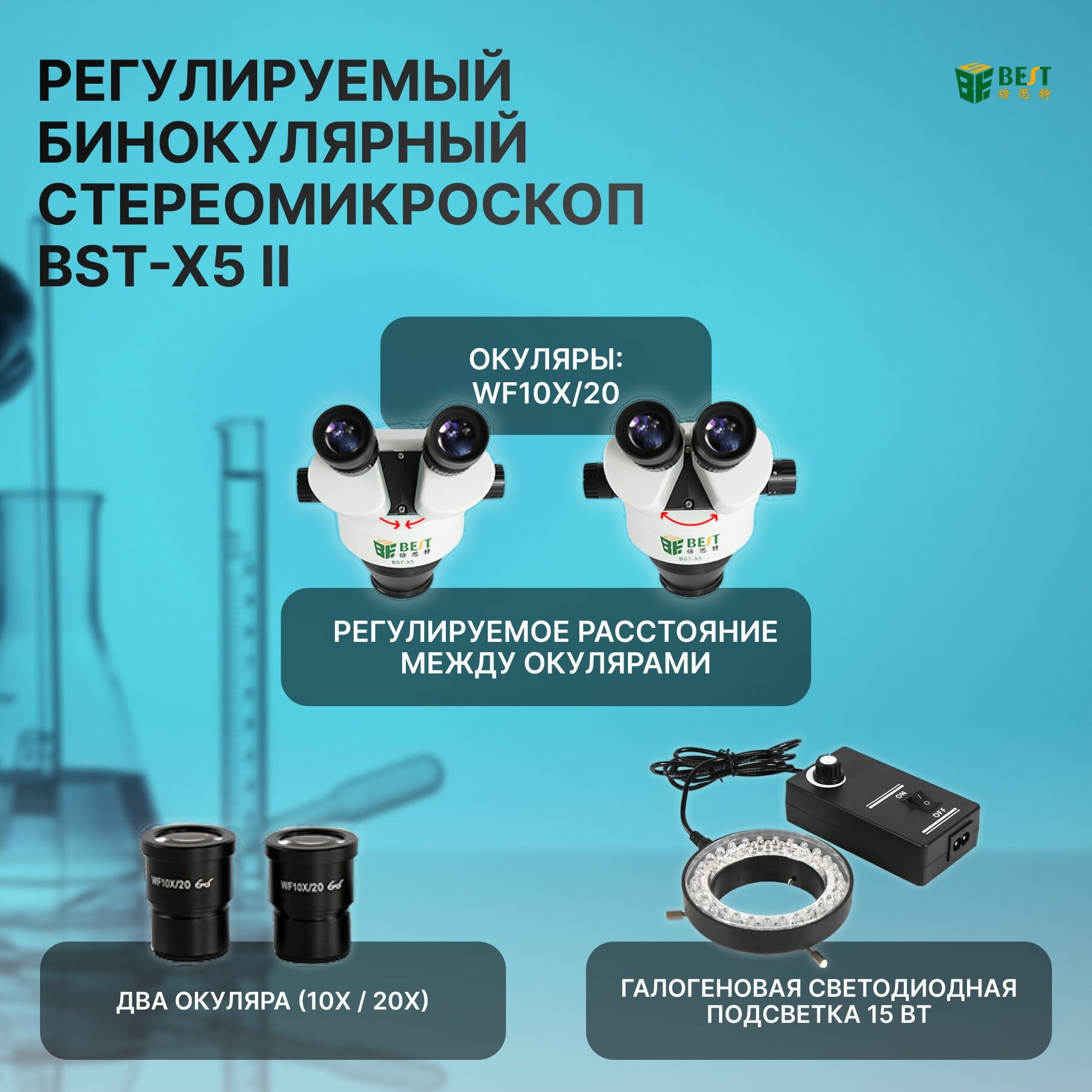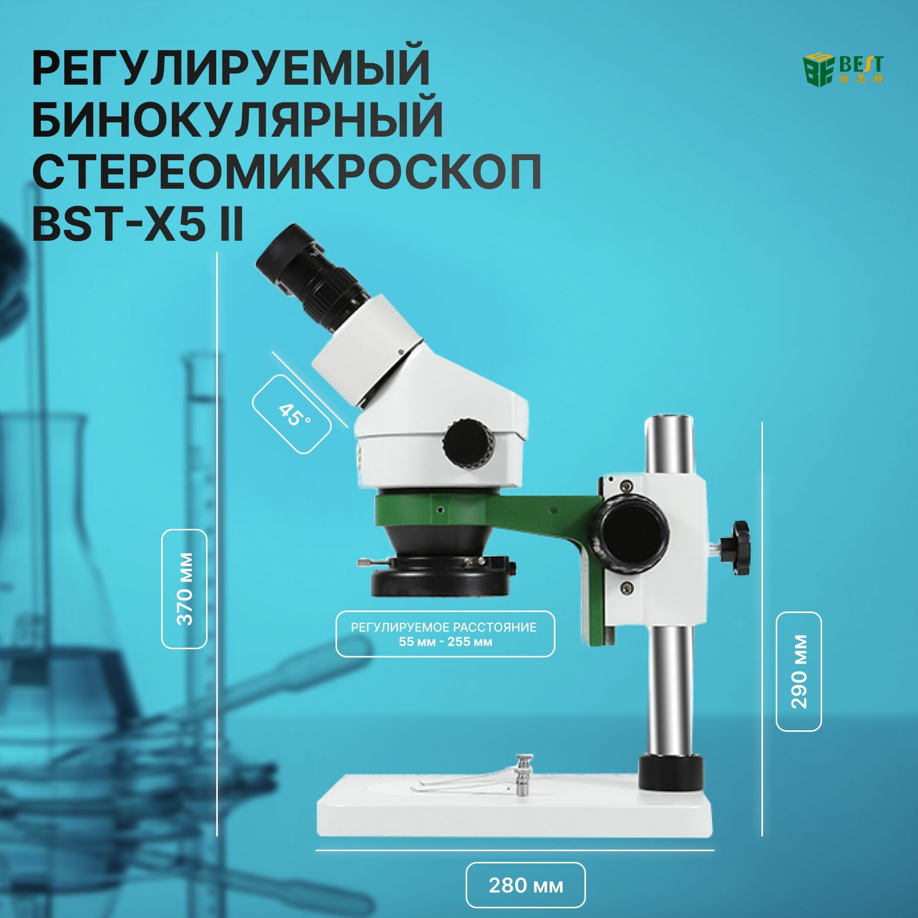 Регулируемый бинокулярный стереомикроскоп BestTool BST-X5 II 7x-45x, WF10X, 12В 15Вт лампа, 45 град угол информация: