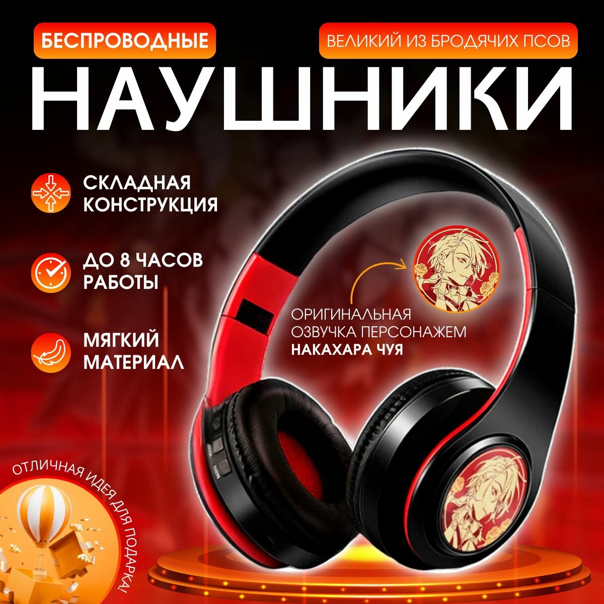 Беспроводные Bluetooth наушники Великий из бродячих псов Накахара Чуя с микрофоном, аниме блютуз гарнитура для телефона информация: