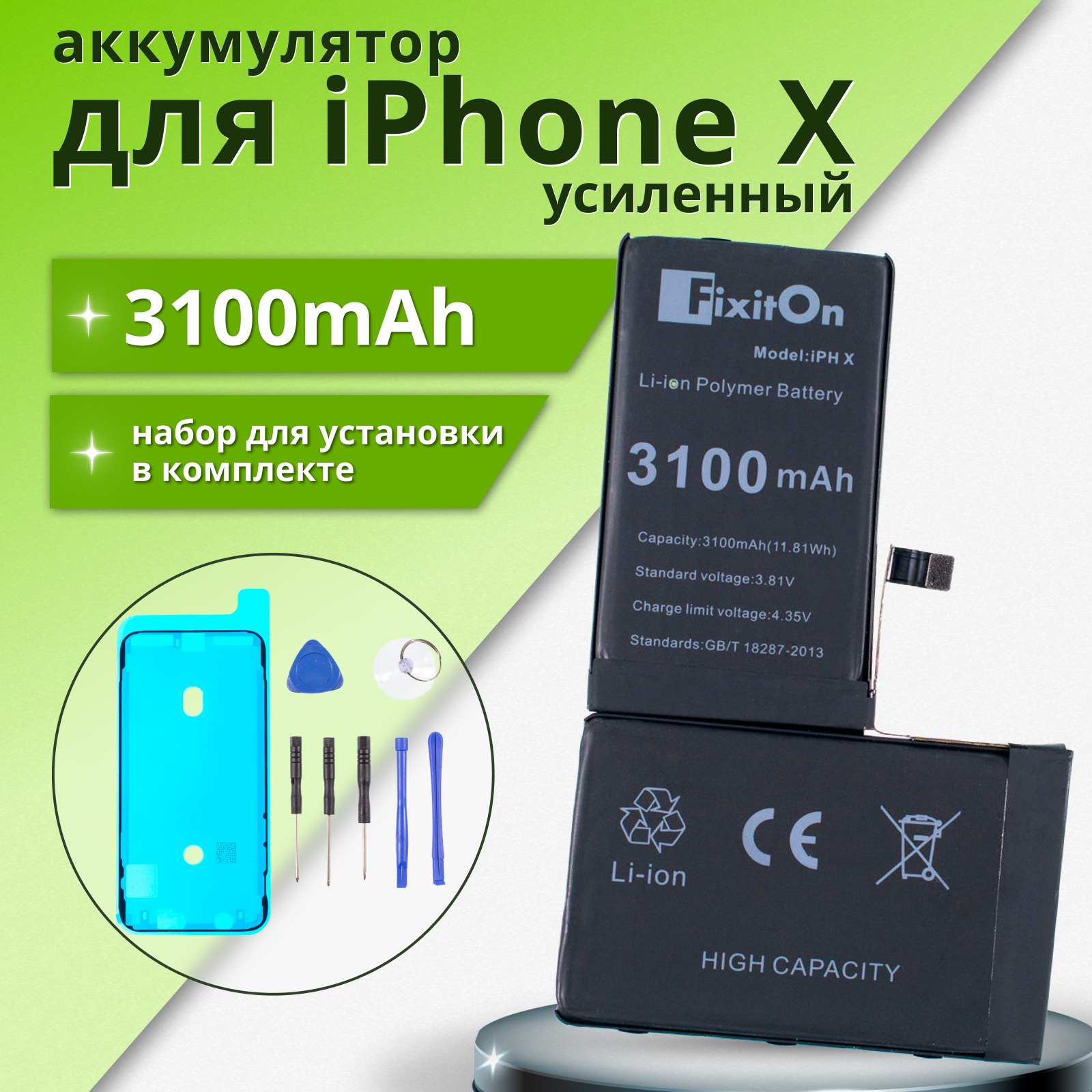 Отзывы на Аккумулятор увеличенной ёмкости FixitOn для iPhone X, Айфон X + набор отверток, скотч, лопатки для разбора