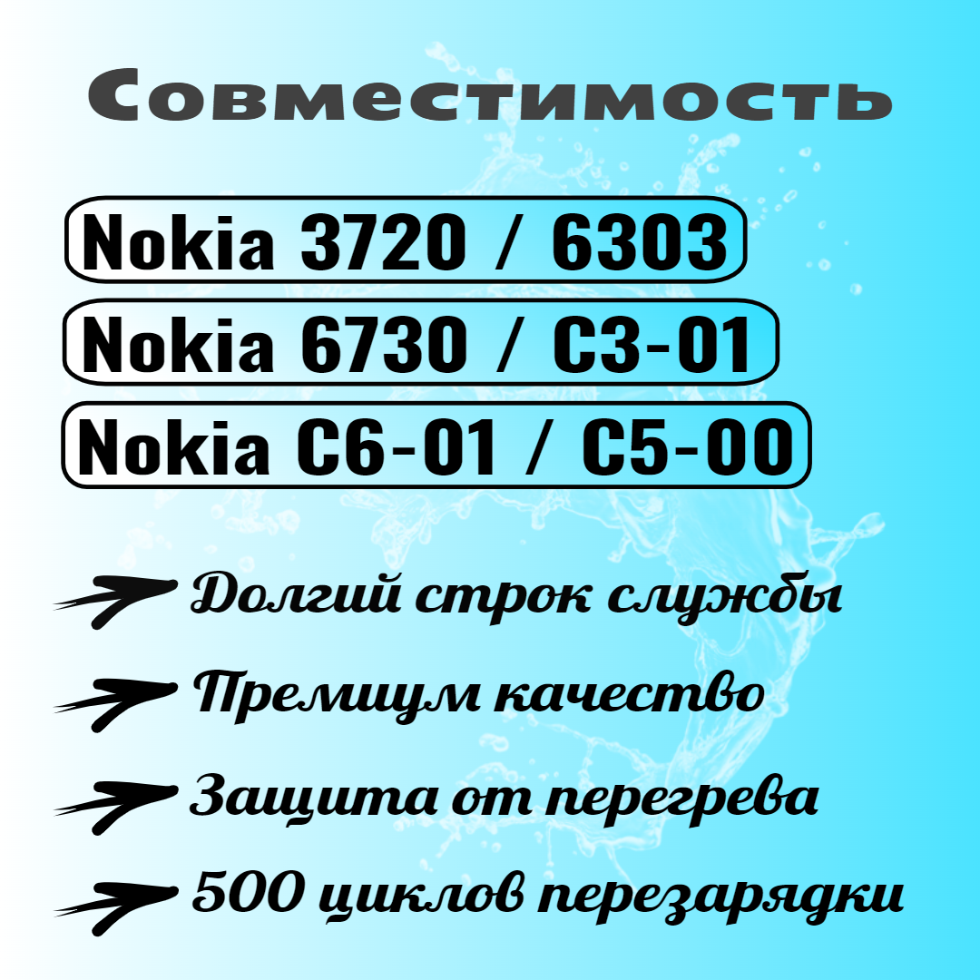 | Совместимые модели | Nokia 5220 / Nokia 5220 XpressMusic / Nokia 6303 Classic / Nokia C3-01 / Nokia C3-01 Gold Edition / Nokia C3-01 RM-640 / Nokia C5-00 / Nokia C5-00 5MP / Nokia C6-01 |