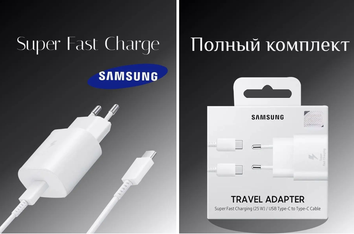 | Дополнительная информация | Зарядное устройство для Samsung с кабелем USB Type-C / Адаптер питания Super Fast Charging 25W / Супер быстрая зарядка 25W /Белый |