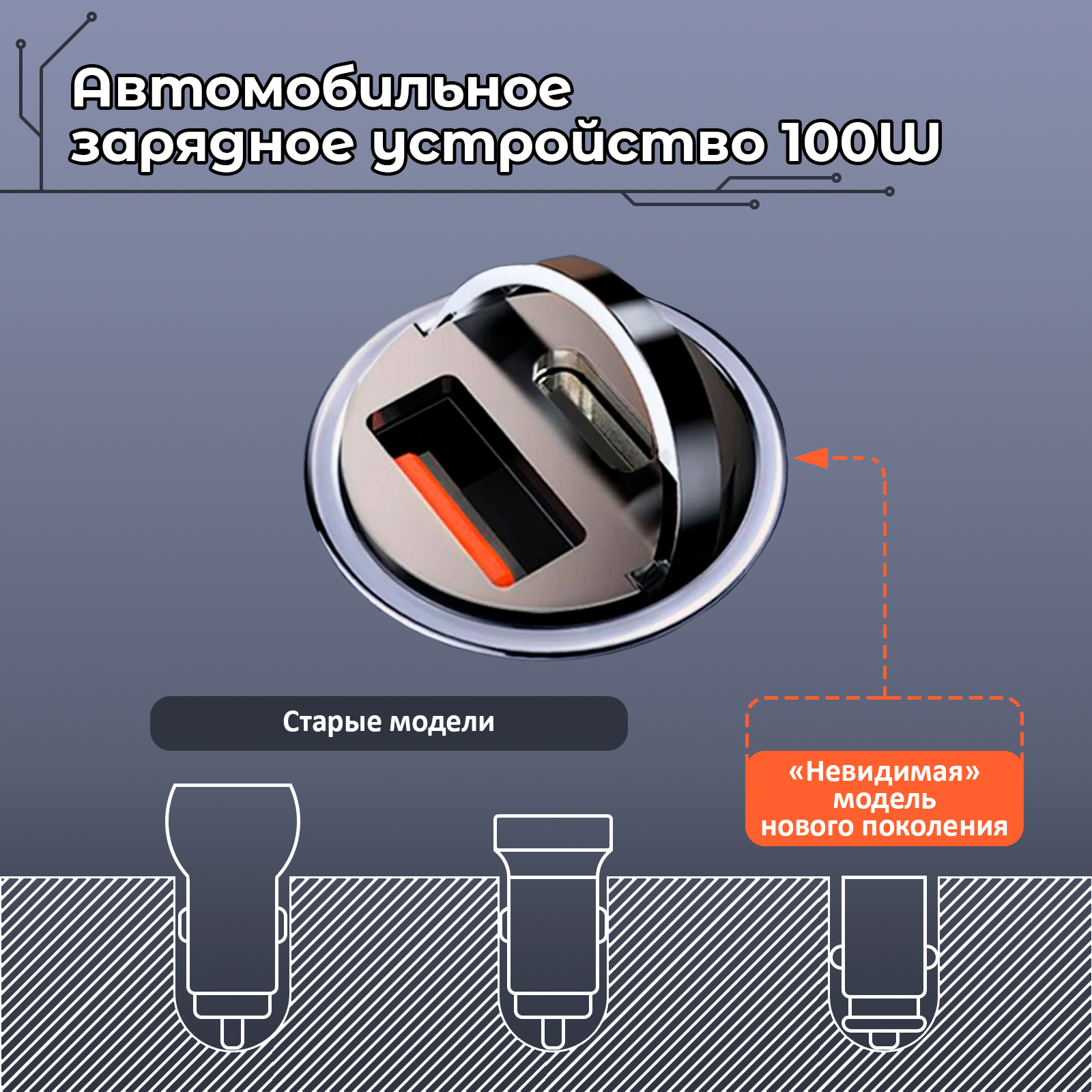 Автомобильное зарядное устройство с 2 разъемами: type-c 100W + usb 100W информация: