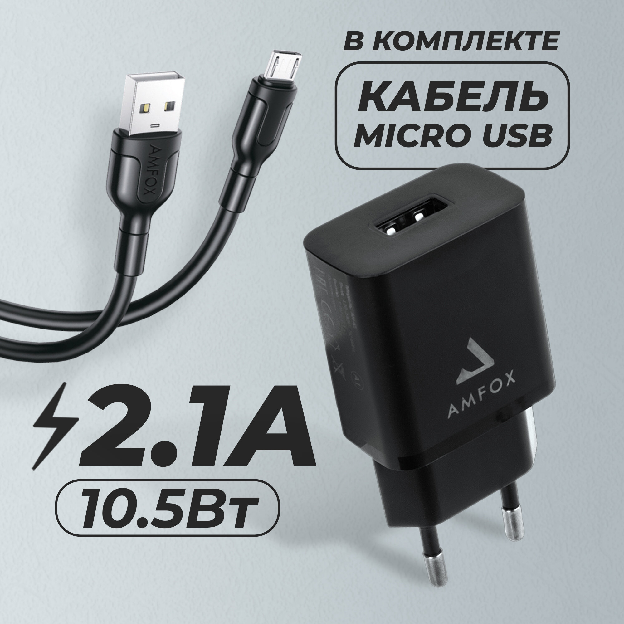 Зарядное устройство, AMFOX, AH-45, 2.1A 10,5 Вт, кабель Micro USB, черное, СЗУ со шнуром, зарядка для айфона, зарядное устройство для телефона информация: