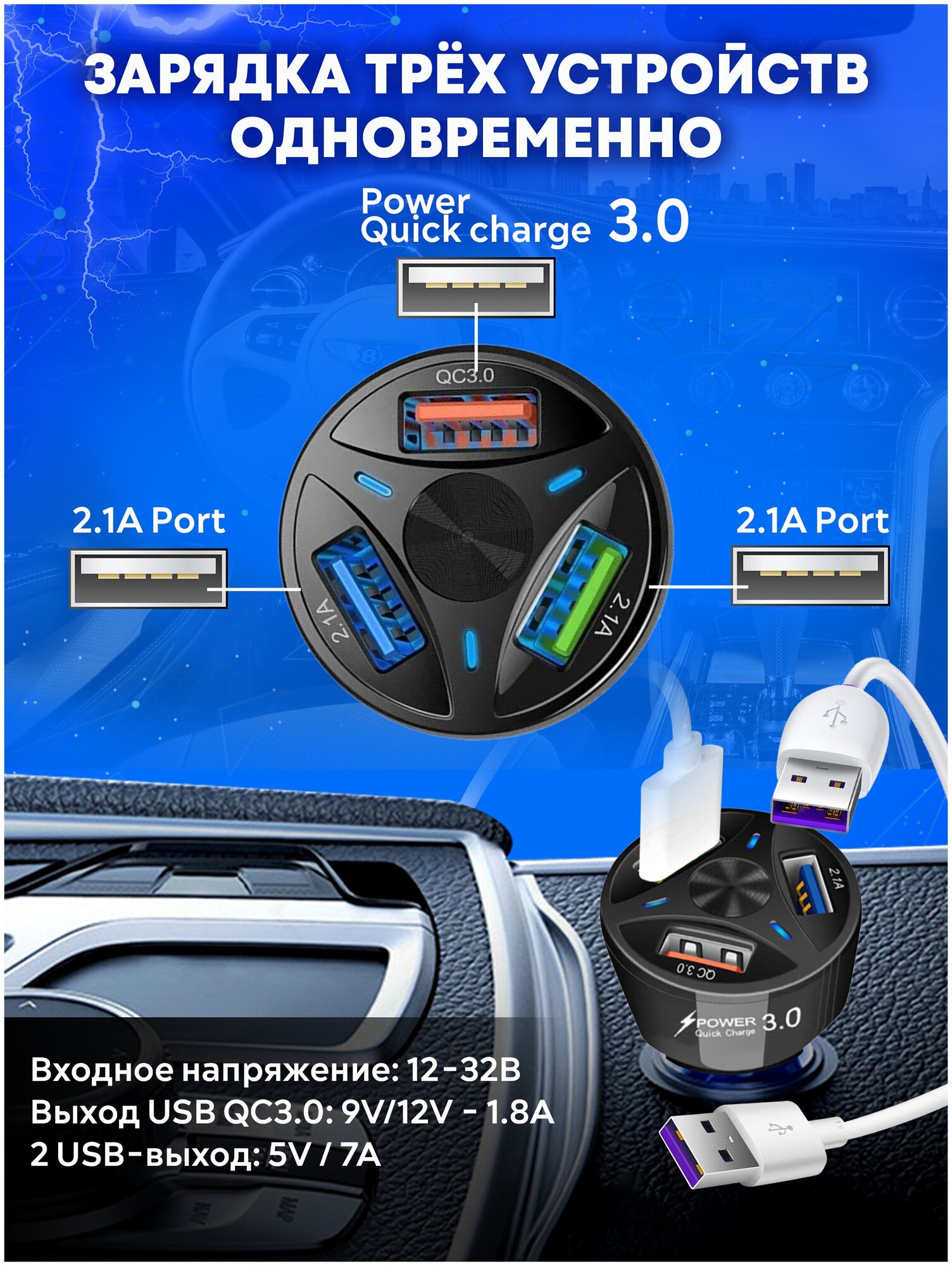 Отзывы на Автомобильное зарядное устройство для телефона на 3 USB, быстрая зарядка в прикуриватель QC3.0, 7А, блок питания черный
