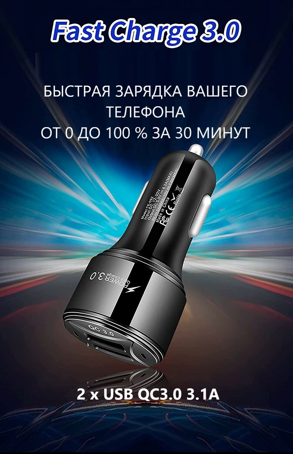 Автомобильное зарядное устройство 36 Вт 2 USB х 3.1А / Быстрая зарядка iphone / блок питания в прикуриватель черный информация: