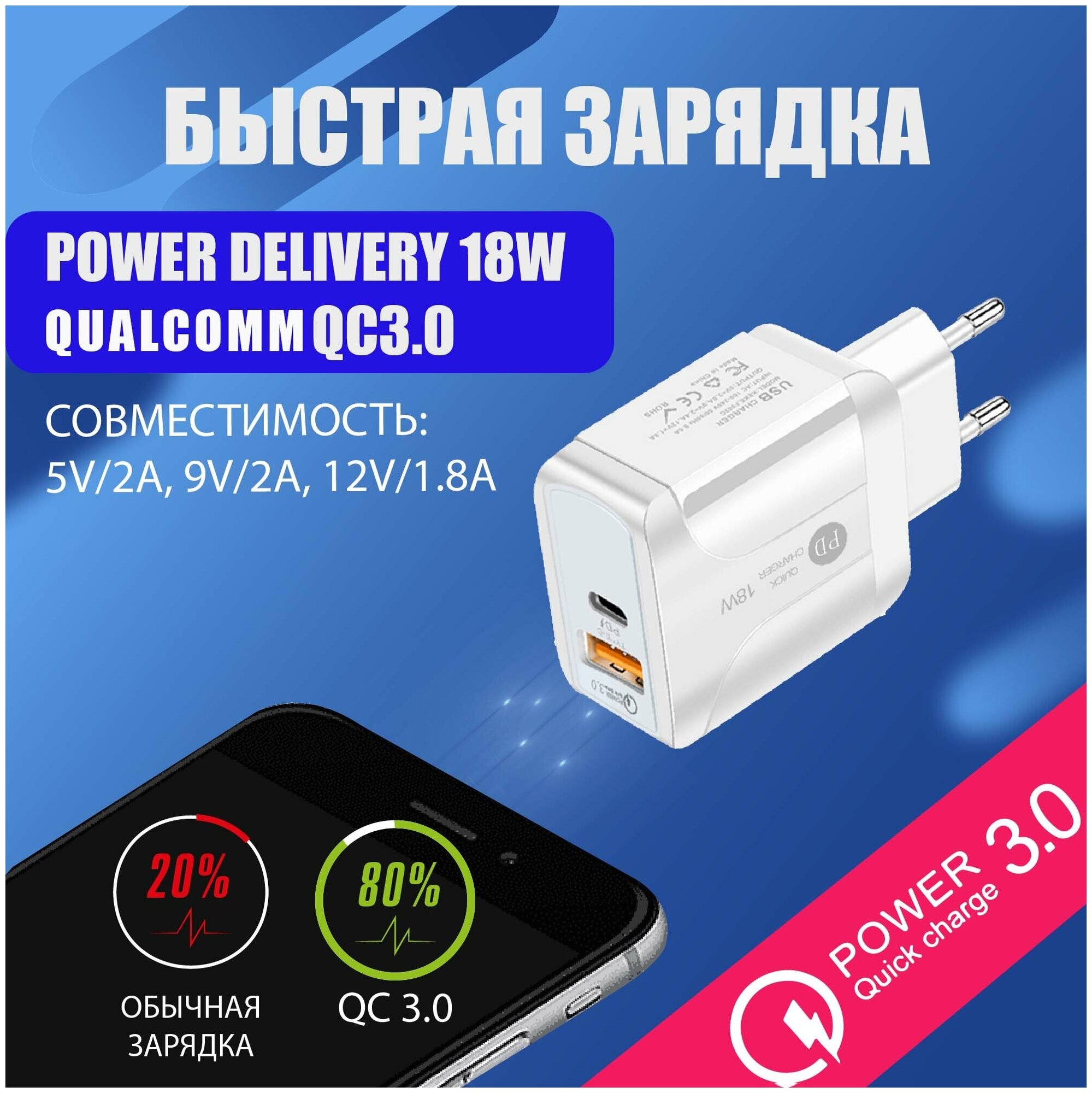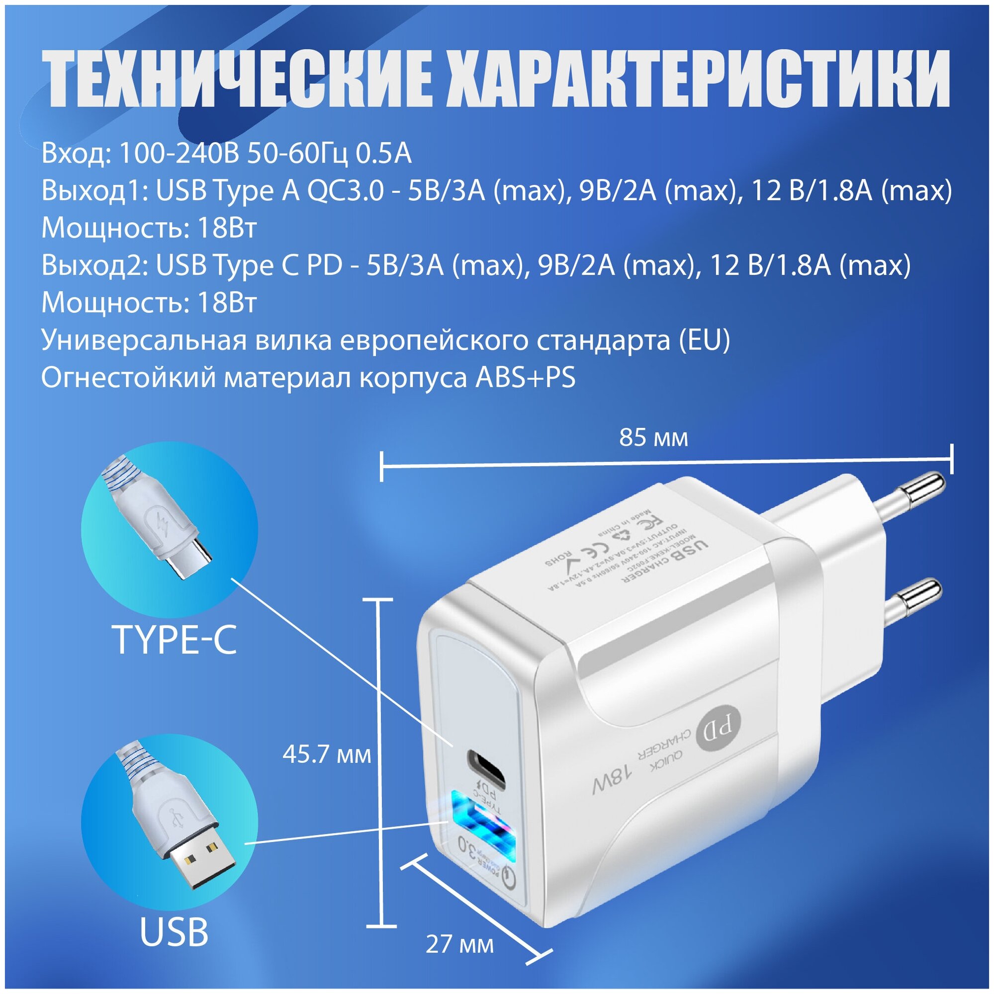 Быстрое зарядное устройство для телефона на 2 порта, Type-C PD и USB 3.0 QC, с кабелем TYPE-C 1 метр, цвет белый информация: