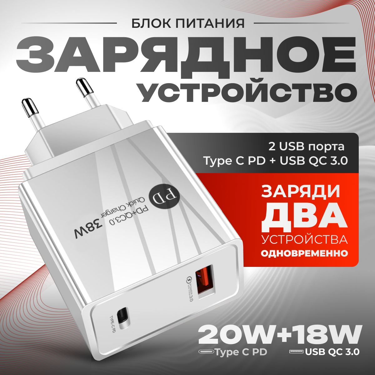 Сетевое зарядное устройство для телефона, 2 USB порта Type C PD + USB QC 3.0, быстрая зарядка для iphone, 20 Вт, белая информация: