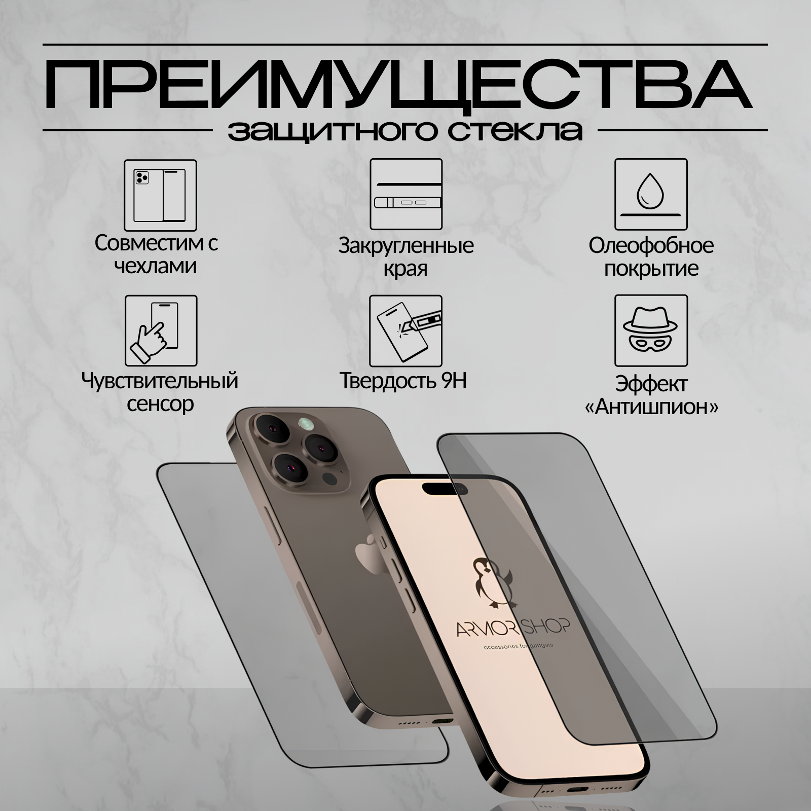 Защитное стекло с "автоматической" установкой для iPhone 15 Pro Max, антишпион информация: