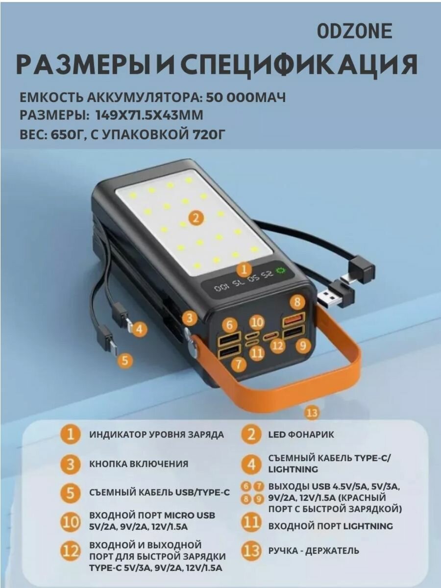 Повербанк 50000 с быстрой зарядкой и фонариком информация: