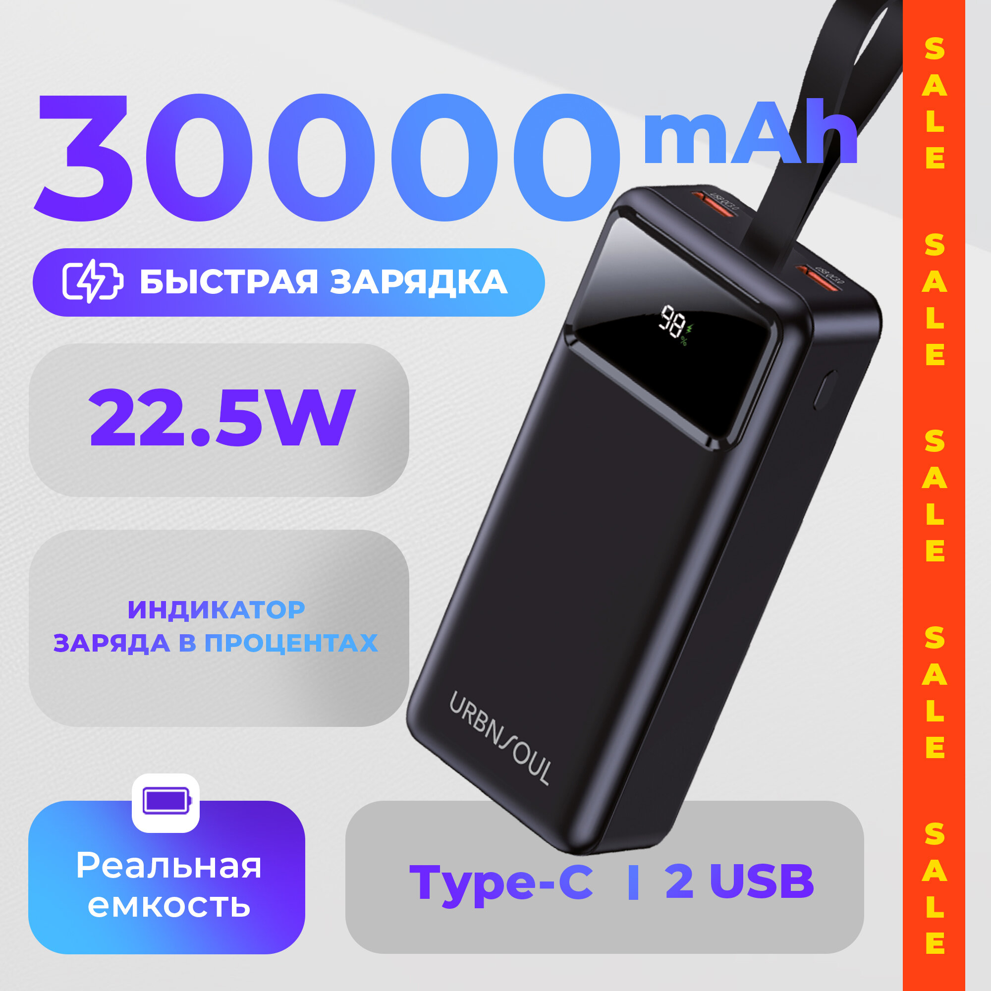 Отзывы на Повербанк 30000 mAh, URBNSOUL, UPB-430, фонарик, 2 USB+Type-C, быстрая зарядка, powerbank, пауэр банк, powerbank xiaomi, повербанк для айфона, черный