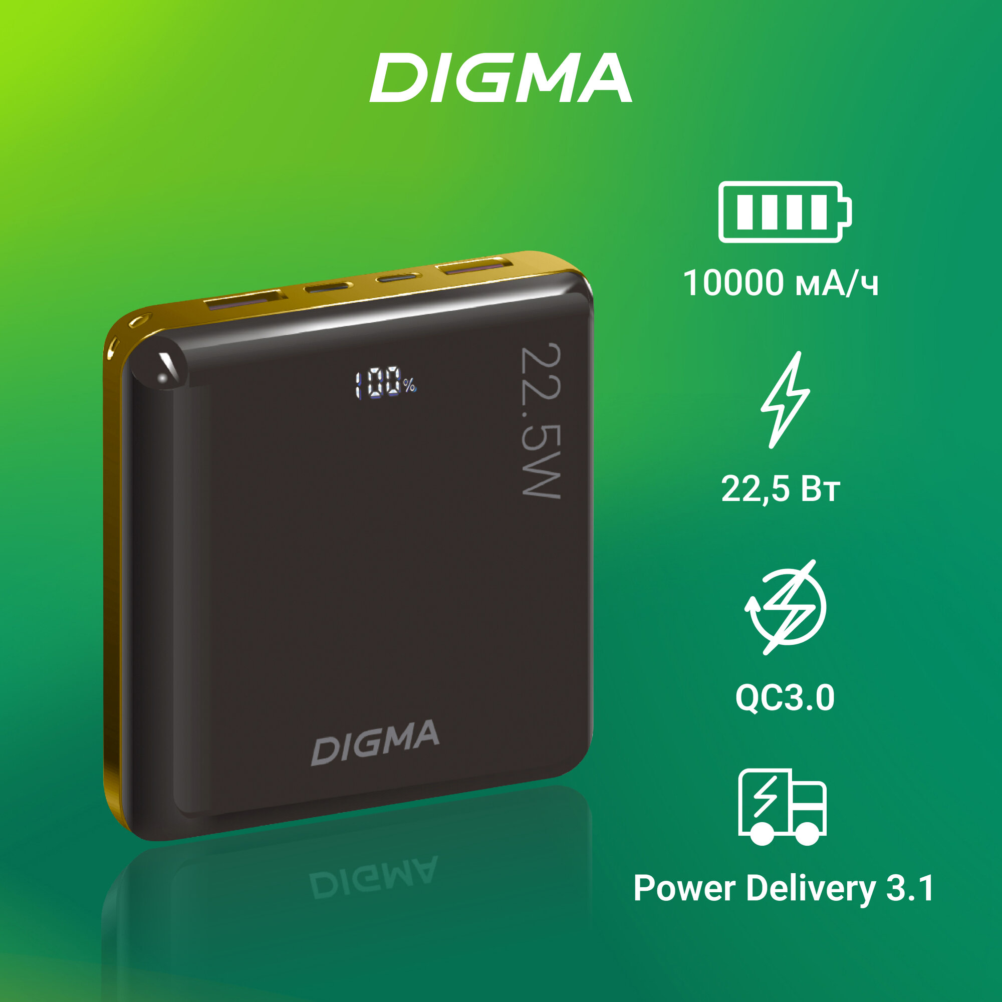Отзывы на Мобильный аккумулятор Digma DGPF10D 10000mAh QC3.0/PD3.0 22.5W 5A 2xUSB-A/USB-C черный/золотой (DGPF10D22PBK)