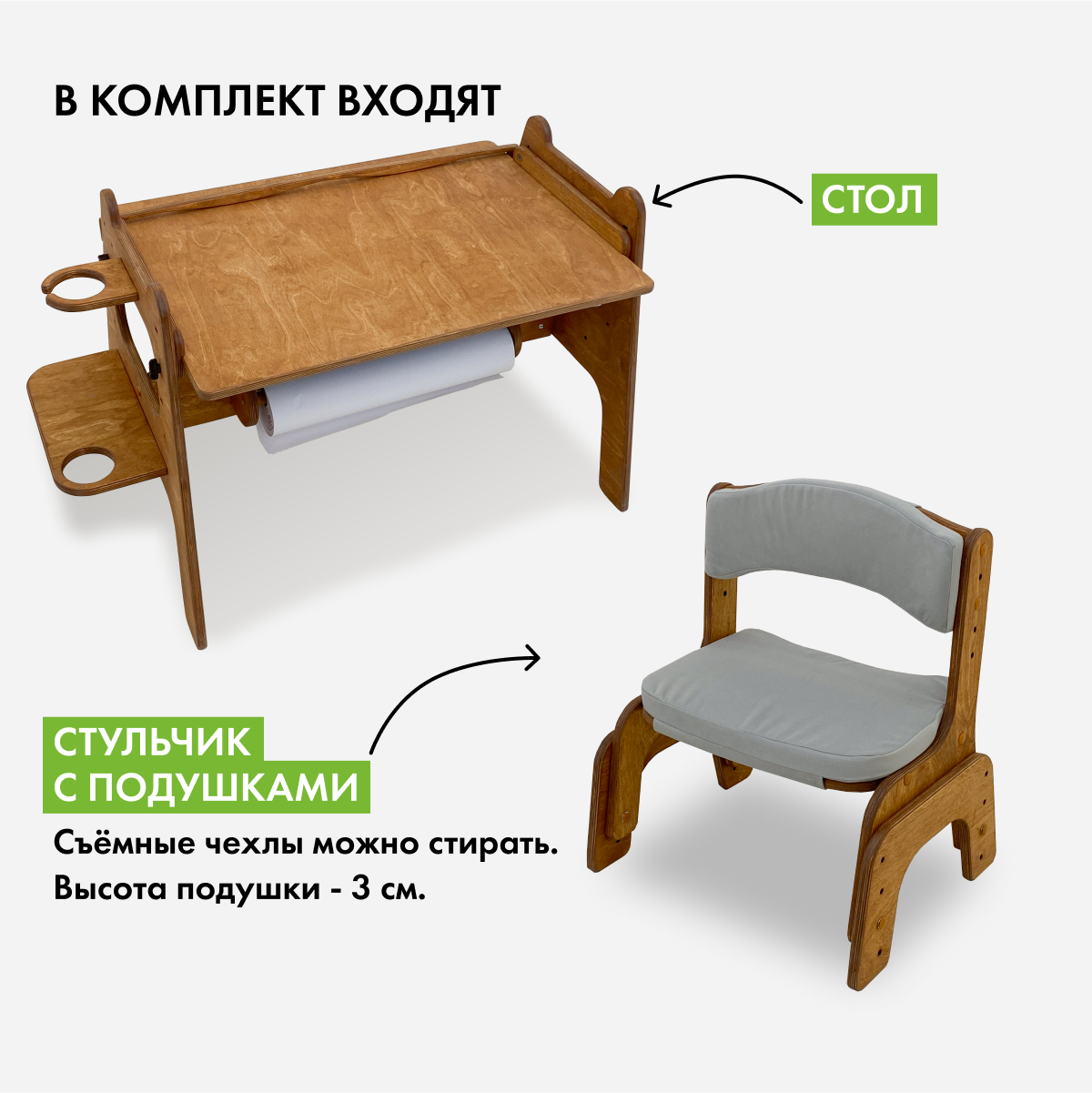 Стол детский Малышок и растущий стул, полная комплектация, прозрачное масло,подушки светло-серые 11 275 ₽