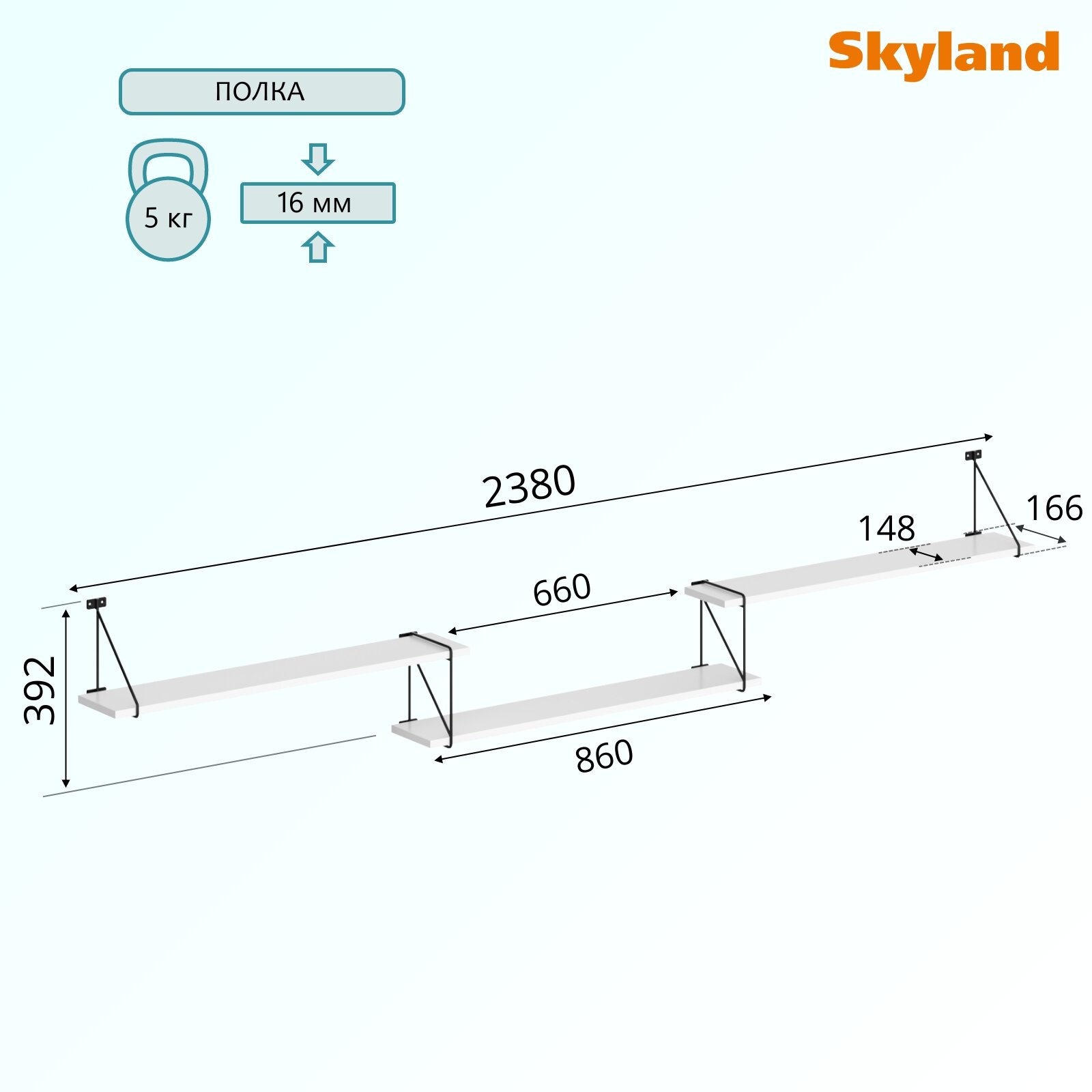 Настенная полка прямая / навесная полка для книг SKYLAND COFFEE SH3-ROD/BAR, белый, 238х16.6х39.2 информация: