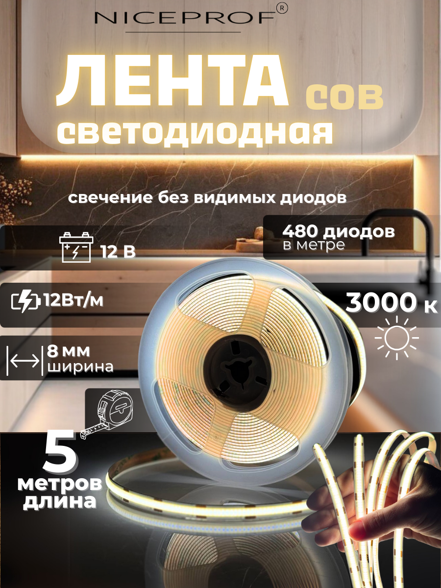 10 цен на Светодиодная лента сплошного свечения Light-led, 5 метров, белый свет, COB, 3000K, 60Вт, 12В, IP20