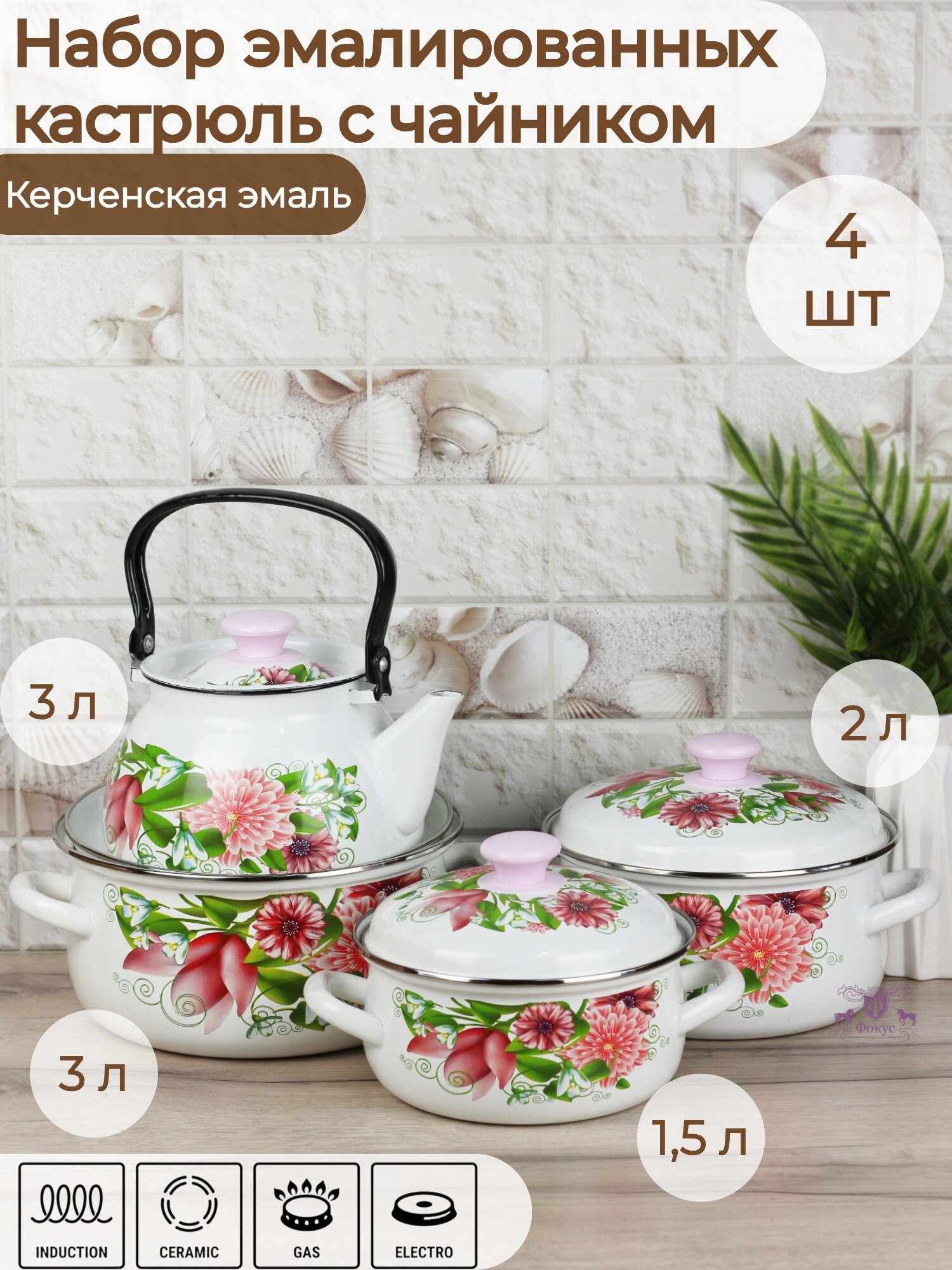 10 цен на Набор кастрюль 3 шт с чайником "Весна белый" (2л, 3л, 4л) Керченская эмаль