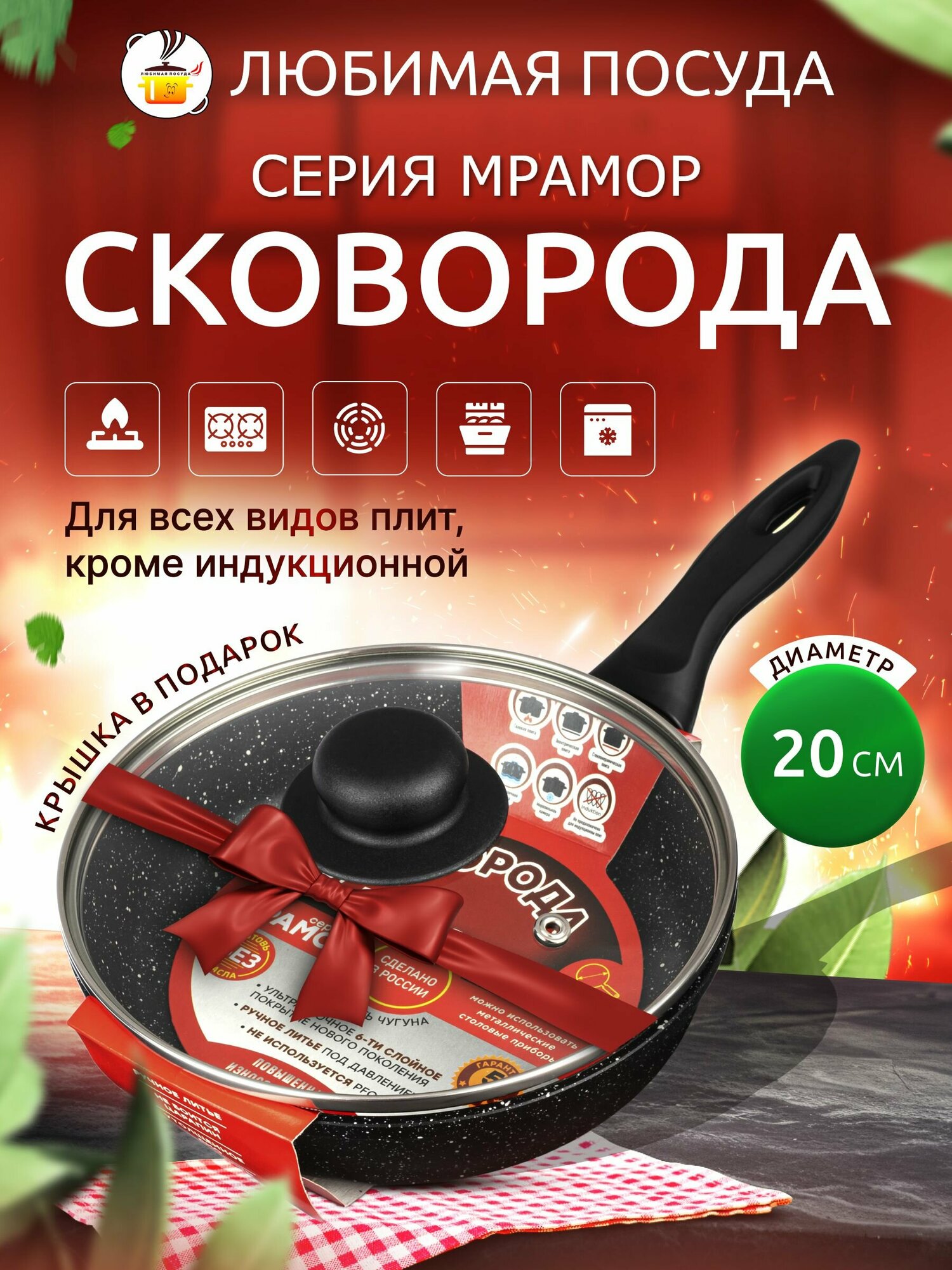 Сковорода 20 см с крышкой, для всех типов плит, кроме индукционной информация: