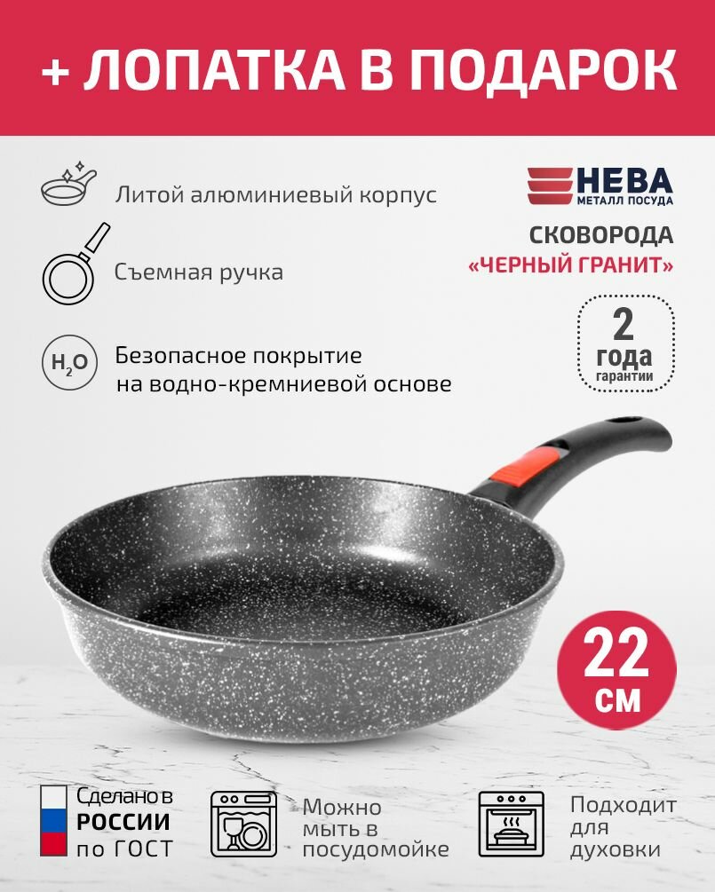 Сковорода 22см съемная ручка нева металл посуда Каменная черный гранит с каменным покрытием + Лопатка в подарок информация: