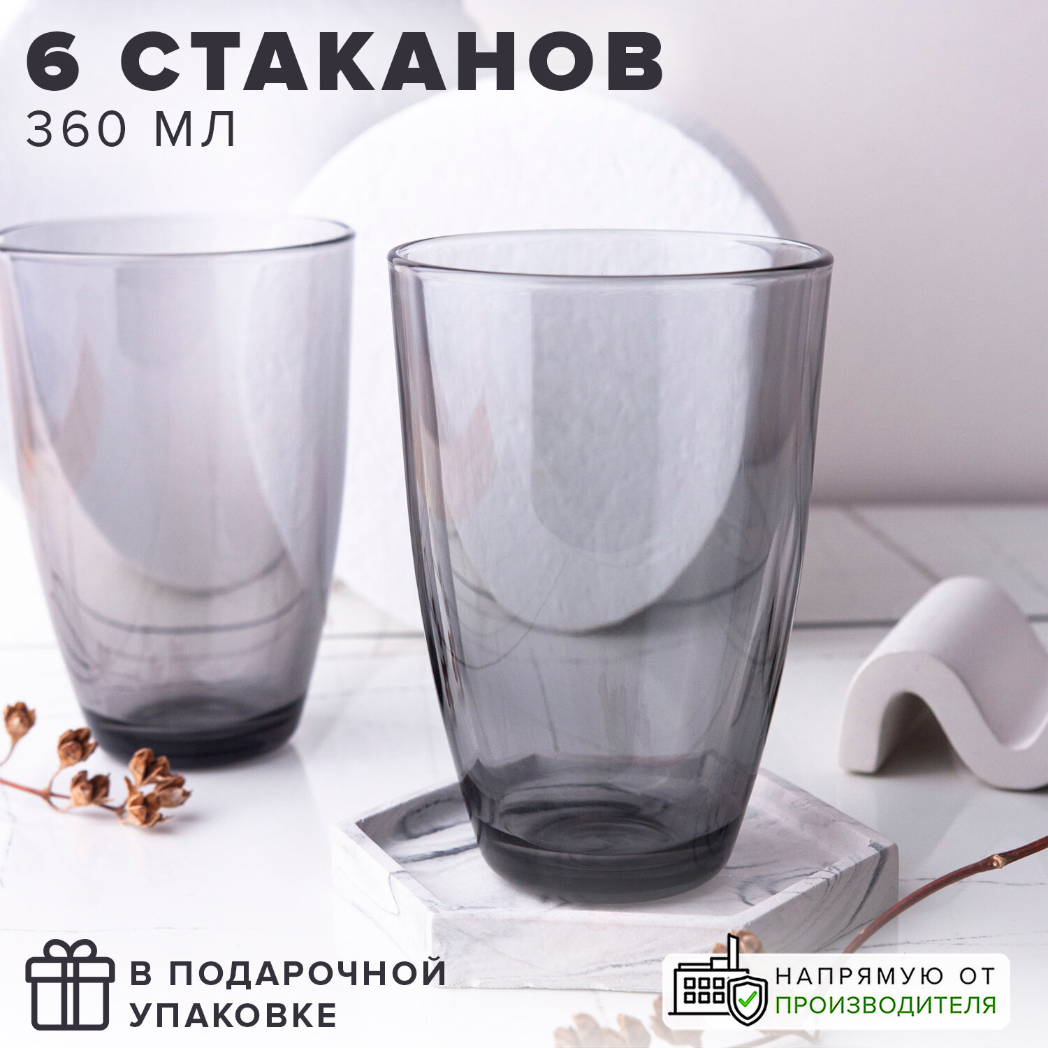 | Дополнительная информация | Стаканы стеклянные 360 мл серого цвета бренда Pasabahce, набор 6 шт. |