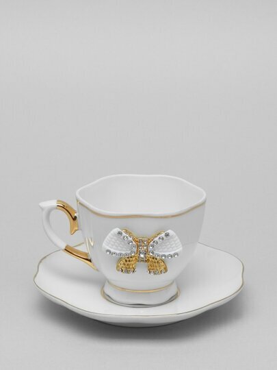 | Комплектация | Фарфоровая чашка 100 мл с блюдцем, из белого фарфора, с декором в виде банта, украшенна стразами |