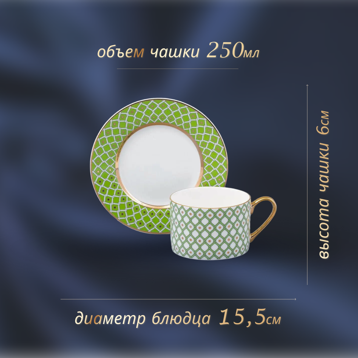Чайная пара, чашка с блюдцем, 250 мл. Императорский фарфоровый завод ИФЗ. Форма "Идиллия", рисунок "Лайм 1". Костяной фарфор. информация: