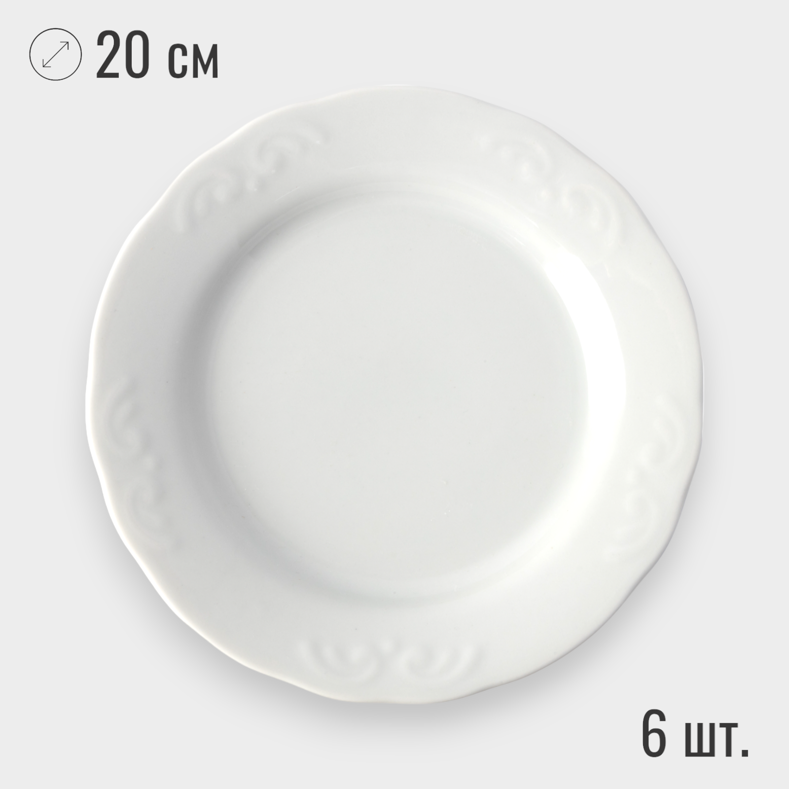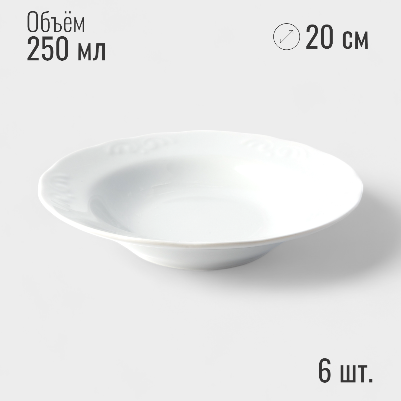| Комплектация | Обеденная тарелка, диаметр 24 см - 6 шт. Глубокая суповая тарелка, диаметр 20 см, объем 250 мл - 6 шт. Десертная тарелка, диаметр 20 см - 6 шт. |