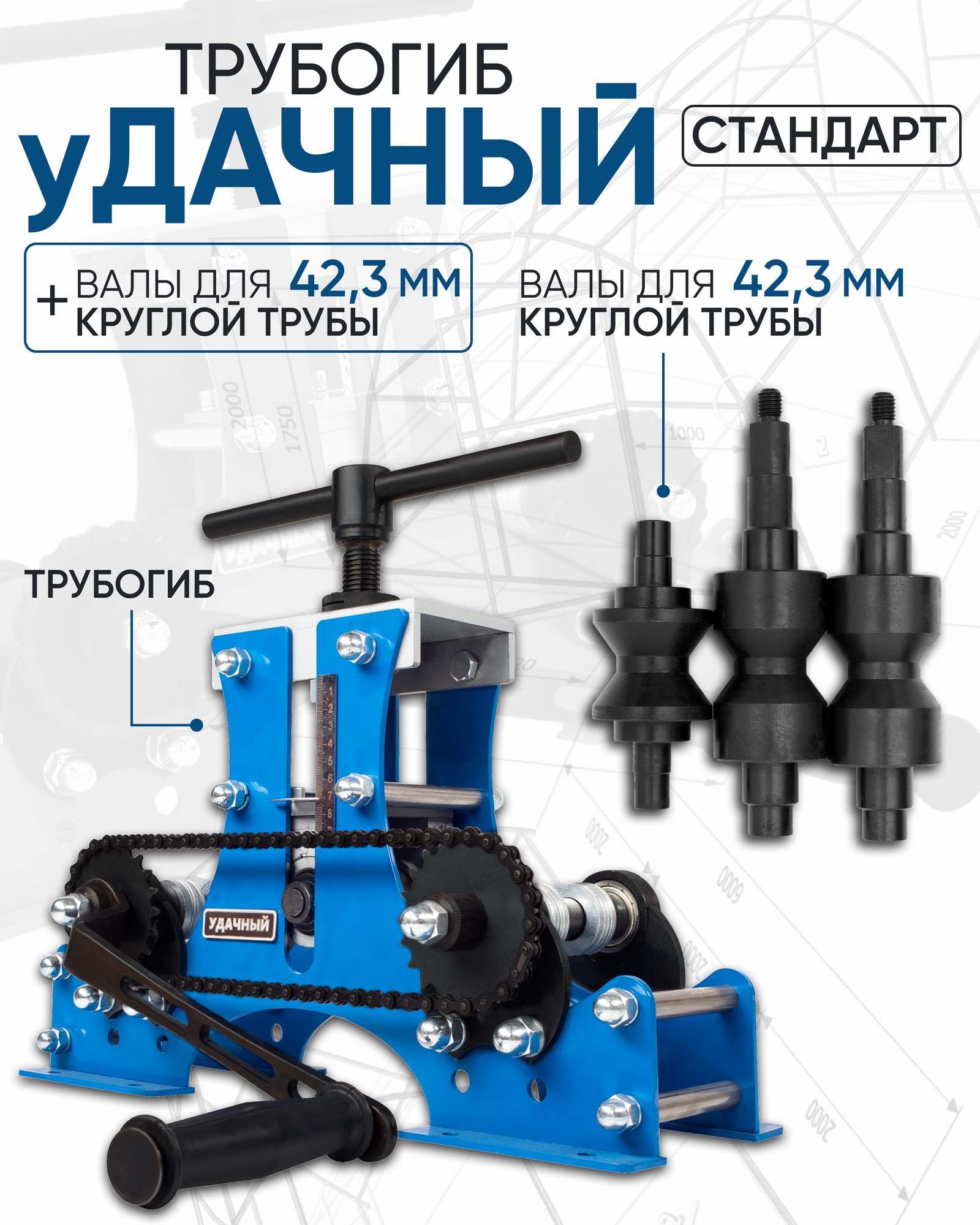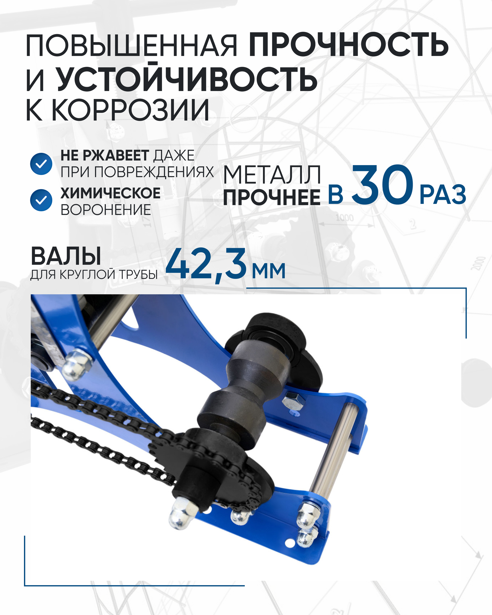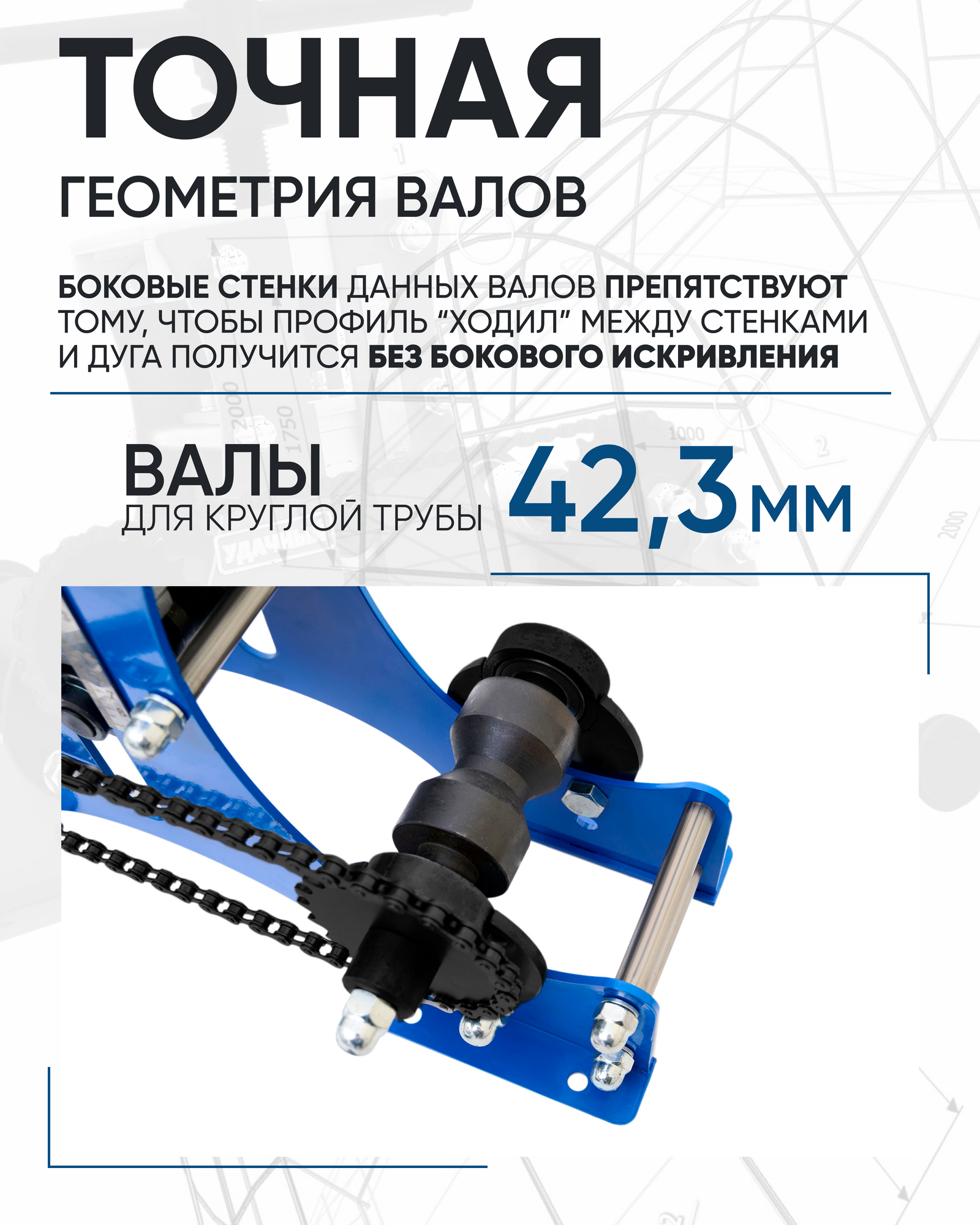 | Комплектация | трубогиб - 1 шт; калёный бочкообразный центральный вал - 1 шт; ролики - 2 шт; цепь - 1 шт; книга чертежей (PDF); инструкция; гарантийный талон; валы для круглой трубы 42,3 мм Удачный Стандарт - 3 шт |