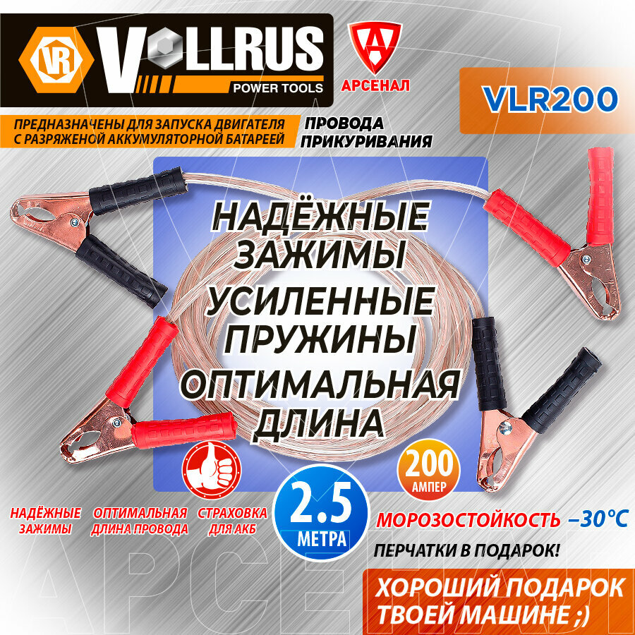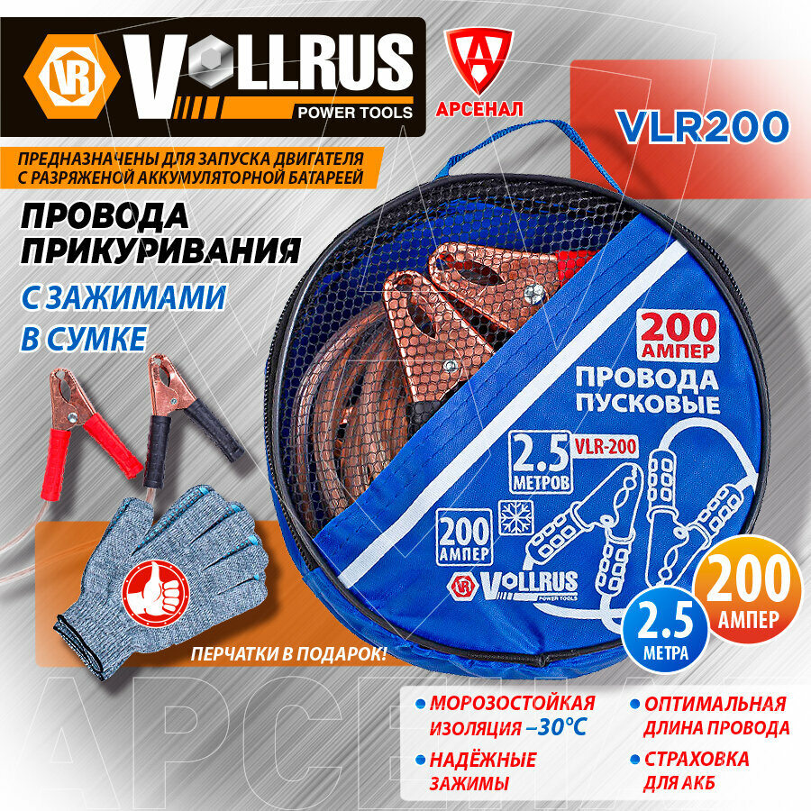 10 цен на Провода прикуривания 200А, длина 2,5 м. с зажимами (в сумке), перчатки в подарок, VLR200