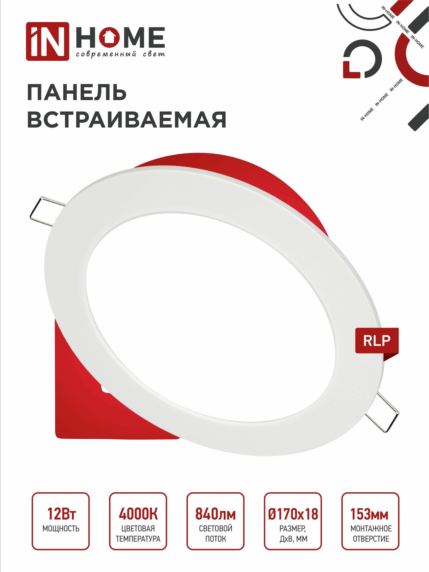 Светильник светодиодный RLP-eco 12Вт 4000К IP40 840лм 230В 170мм ДВО кругл. встраив. панель бел. IN HOME 4690612010007 информация: