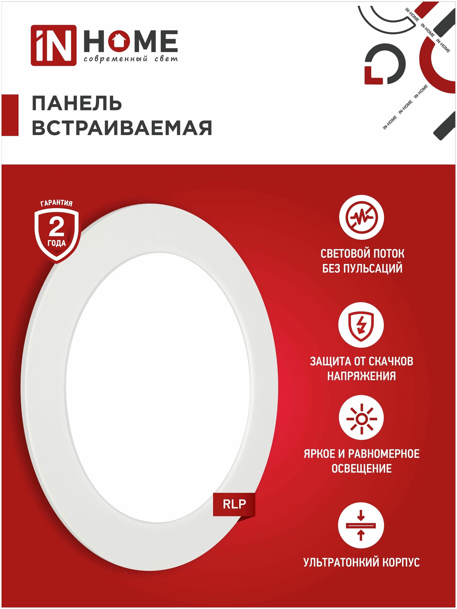 IN HOME Панель сд встраиваемая круглая RLP 6Вт 230В 6500К 420Лм 120мм белая IP40 (арт. 4690612038452) 280 ₽