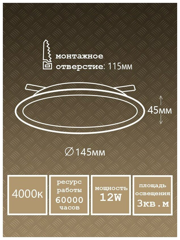 Светодиодный встраиваемый светильник 12 вт 4000К информация:
